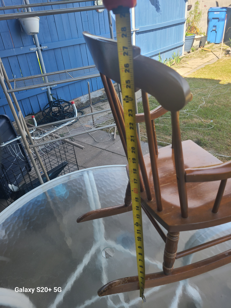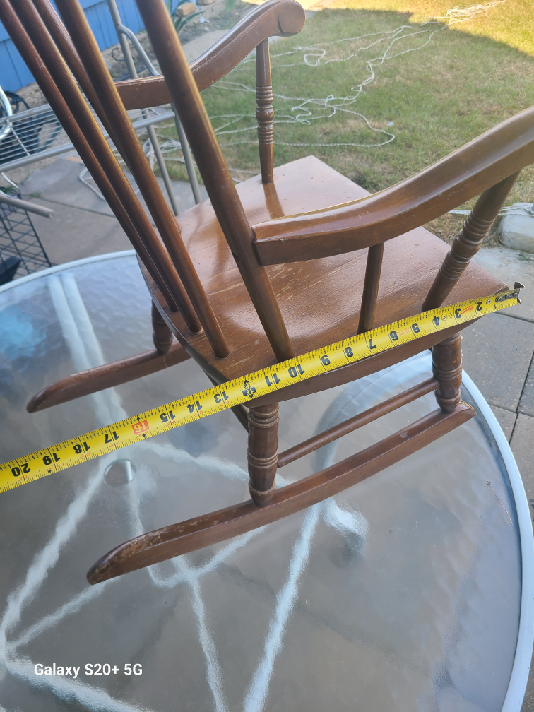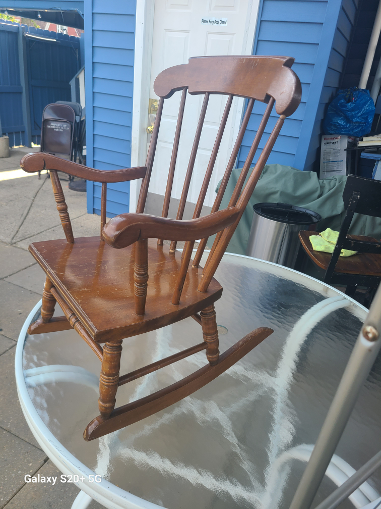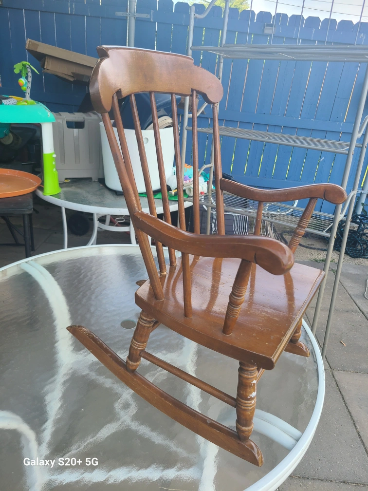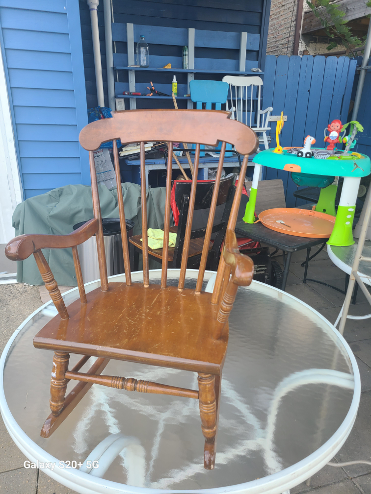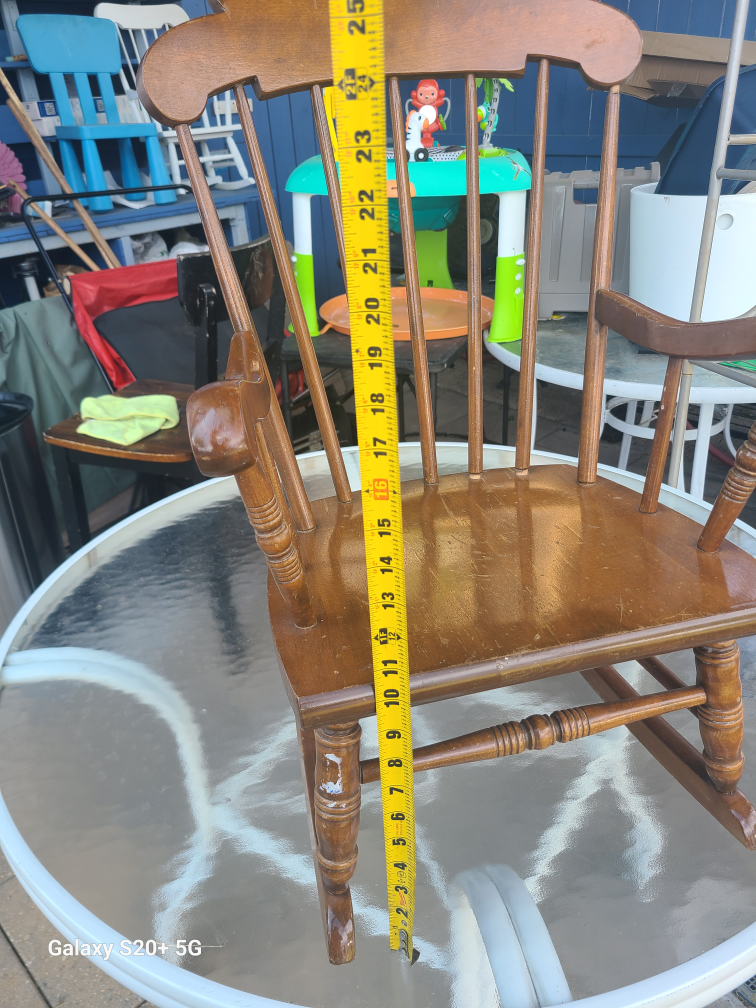 Selling a cute wooden rocking chair, perfect for a kid's room or nursery! It's in good condition and ready for a new home. The chair is approximately 25 inches tall.