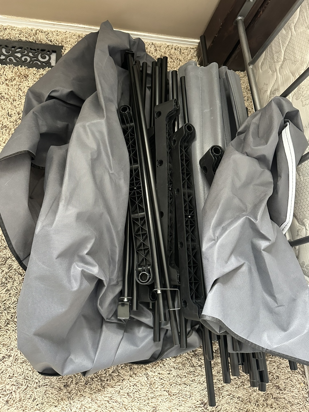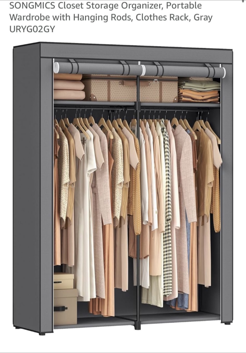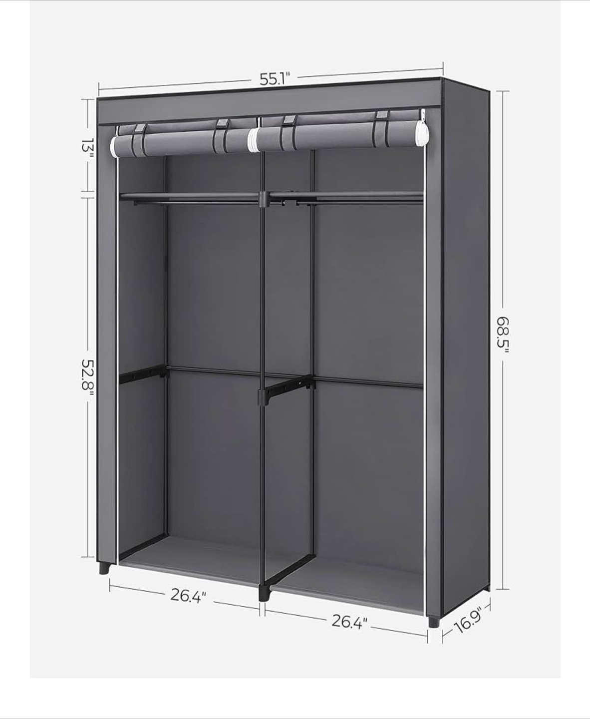 Selling a SONGMICS closet storage organizer in gray! It's a portable wardrobe with hanging rods and a clothes rack. The model number is URYG02GY. Dimensions are approximately 55.1" wide, 68.5" high, and 16.9" deep. Great for adding extra storage space!