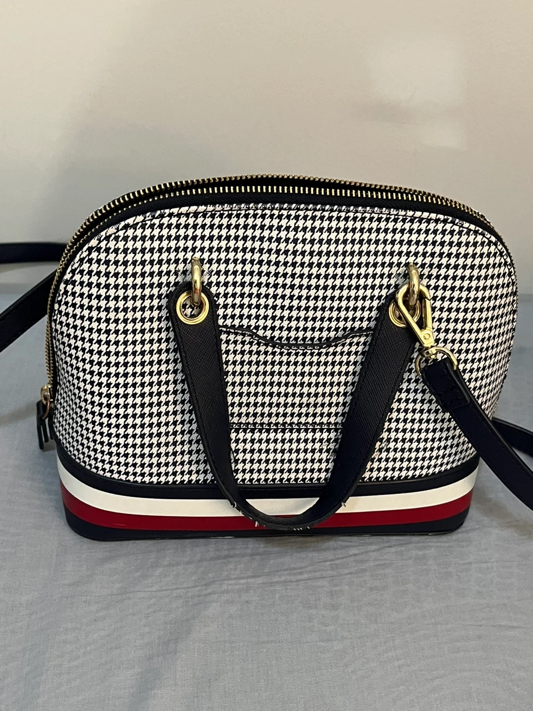 Tommy Hilfiger dome satchel! It features a classic houndstooth pattern in black and white, with red, white, and blue accent stripes. The gold-tone hardware adds a touch of elegance. It's perfect for everyday use or a special occasion