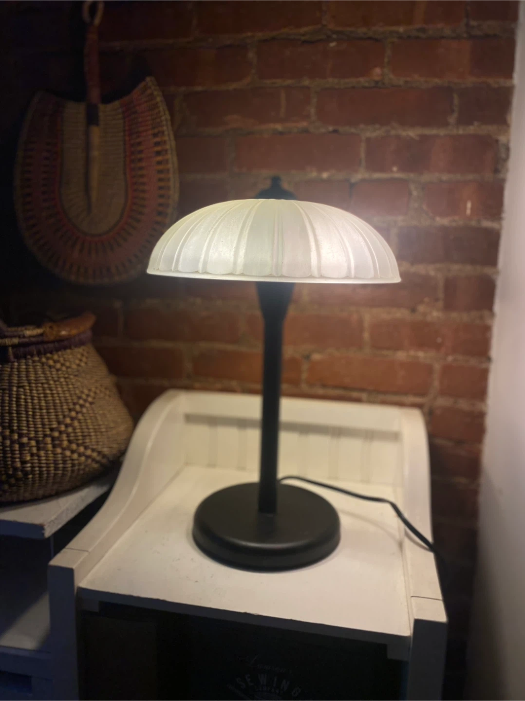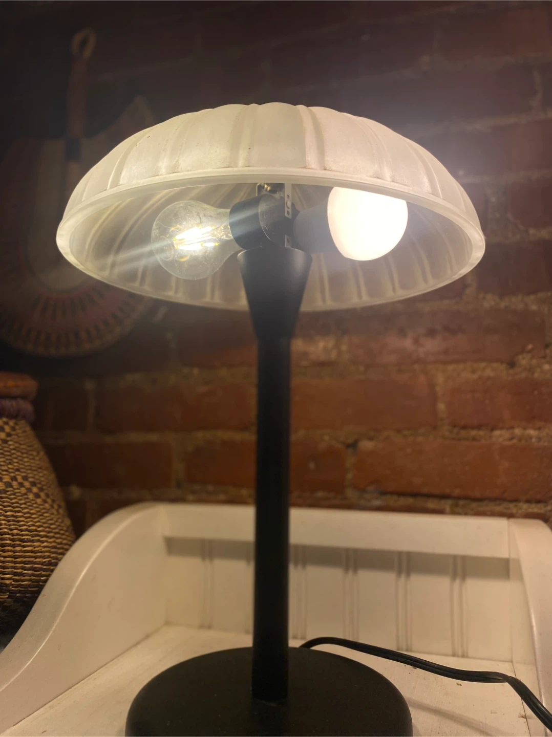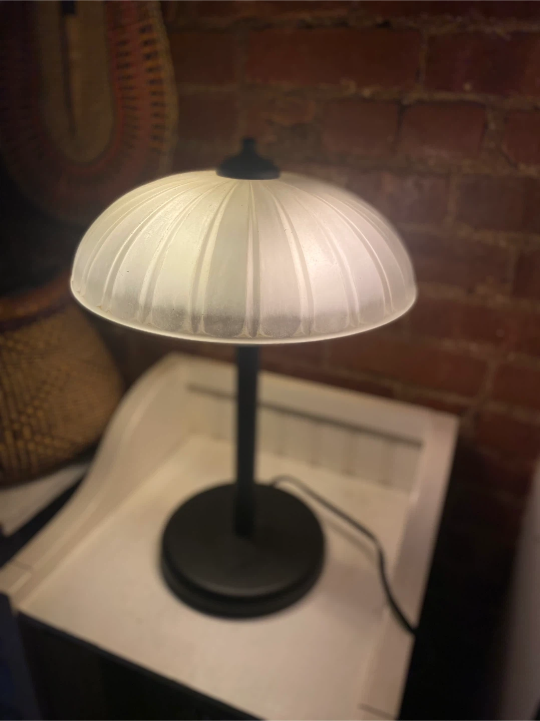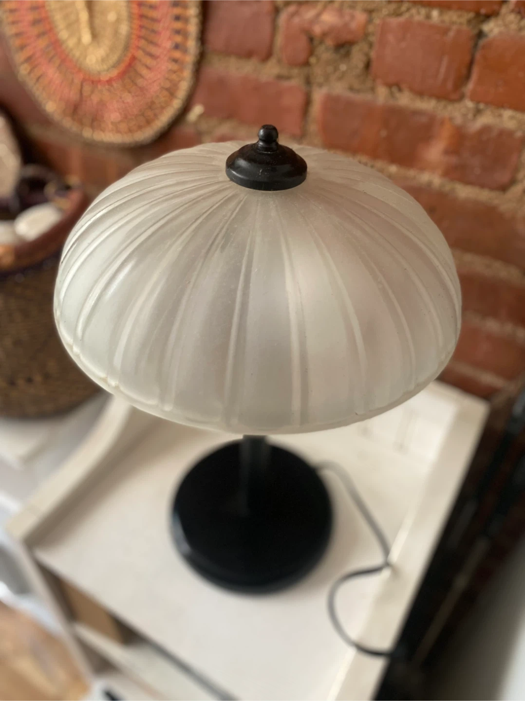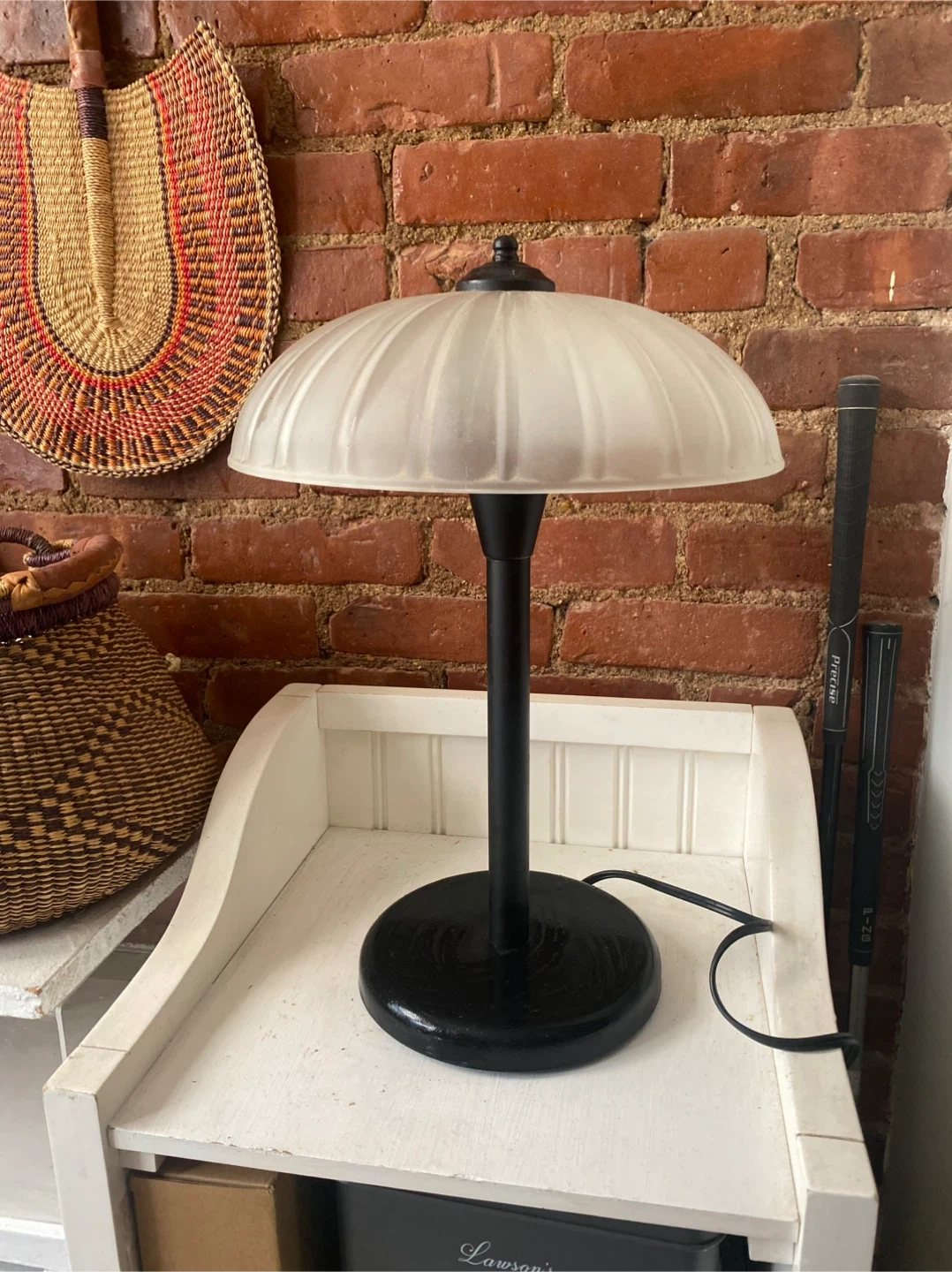 This is a simple and stylish table lamp featuring a black base and a frosted glass shade. It gives off a soft, ambient light, perfect for a bedside table or desk. It's in great condition and ready to brighten up your space!