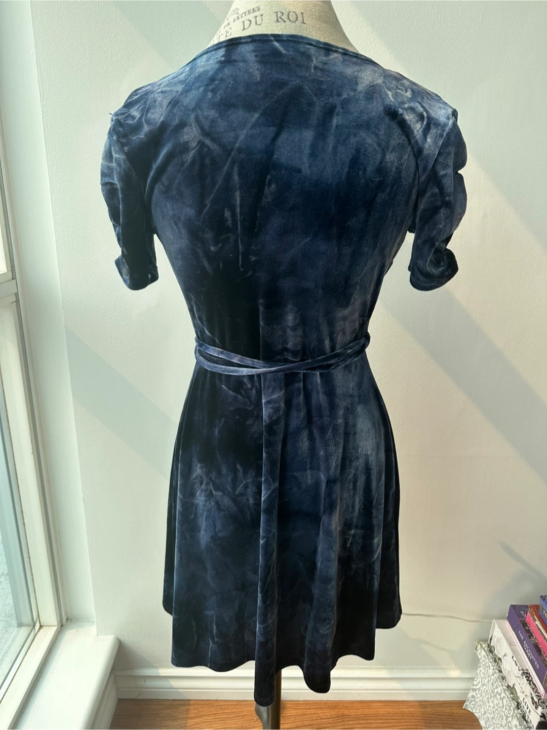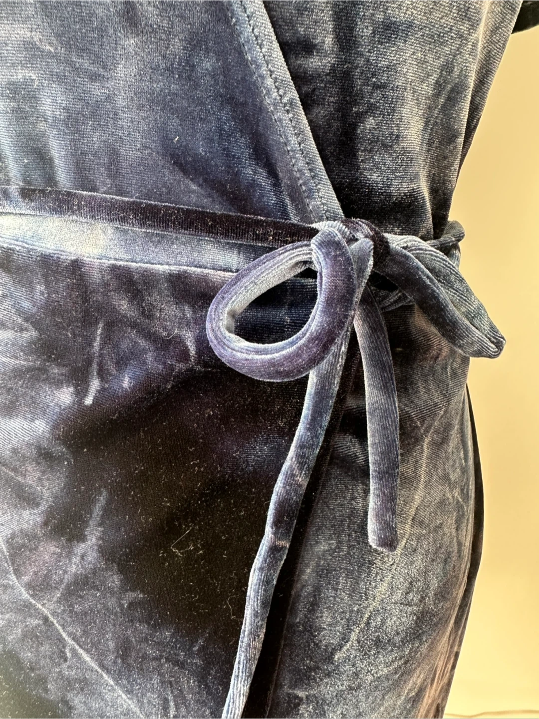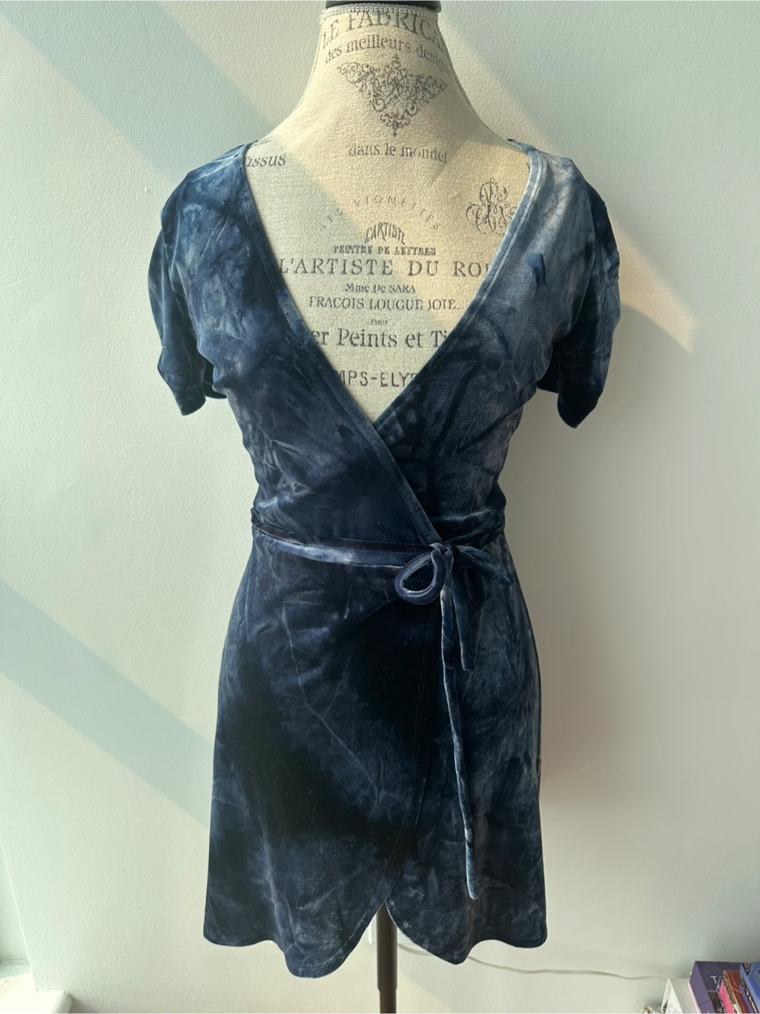 Selling a lovely blue velvet wrap dress! It has short sleeves and a tie at the waist. The material is soft and comfortable, perfect for a night out or a special occasion