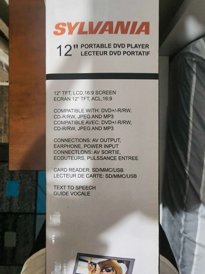 I am selling a brand new Sylvania 12" portable DVD player with an LCD screen. It features a built-in card reader for SD/MMC/USB, a rechargeable battery, and includes an AC adapter, car adapter, AV cable, and remote control.