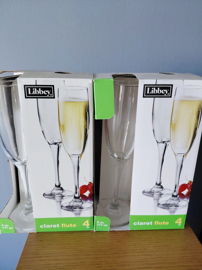 Selling two sets of Libbey Claret Flute glasses, each containing 4 glasses. Each glass holds 6 oz (177 ml). Perfect for celebrations or adding a touch of elegance to your everyday dining!
