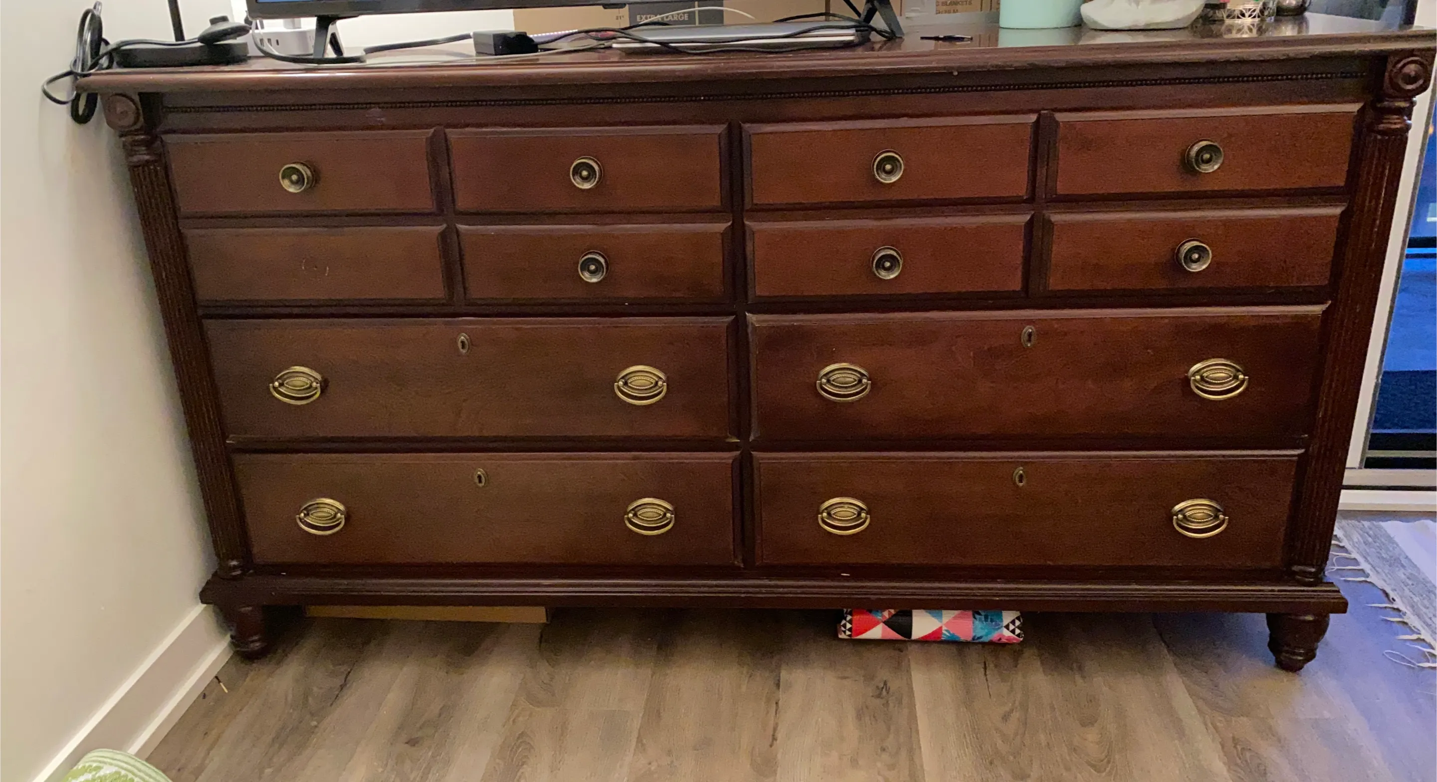 Here's a lovely antique dresser with a beautiful brown finish. It has a classic design with multiple drawers, perfect for adding some vintage charm to your home. The dresser is in good condition and ready for a new home