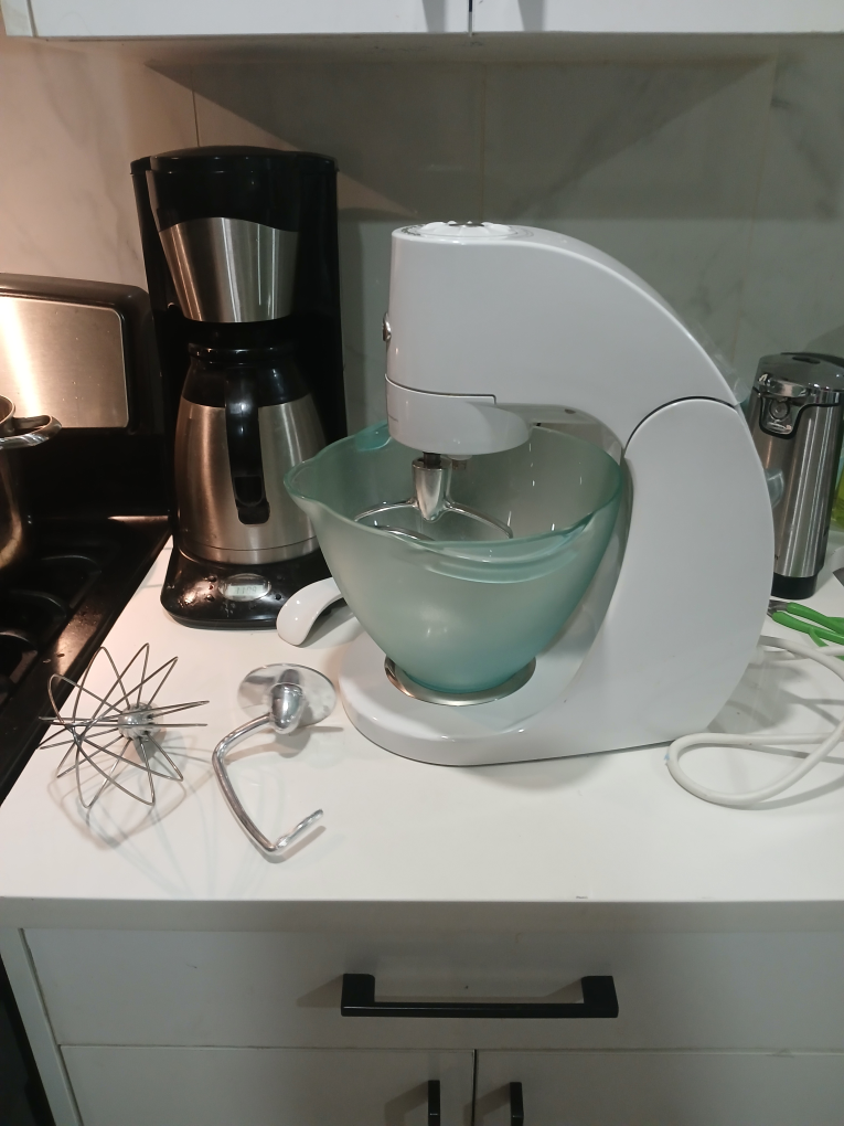 Selling a used stand mixer. It comes with a mixing bowl and two attachments: a whisk and a dough hook. It's in good working condition and ready for your baking needs!