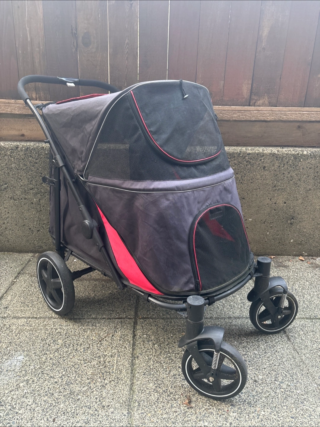 Selling a gently used larger pet stroller in black and red! It's perfect for taking your furry friend for walks in comfort and style. The stroller features a mesh top for ventilation and easy viewing, and sturdy wheels for a smooth ride. It's in great condition and ready for a new home!