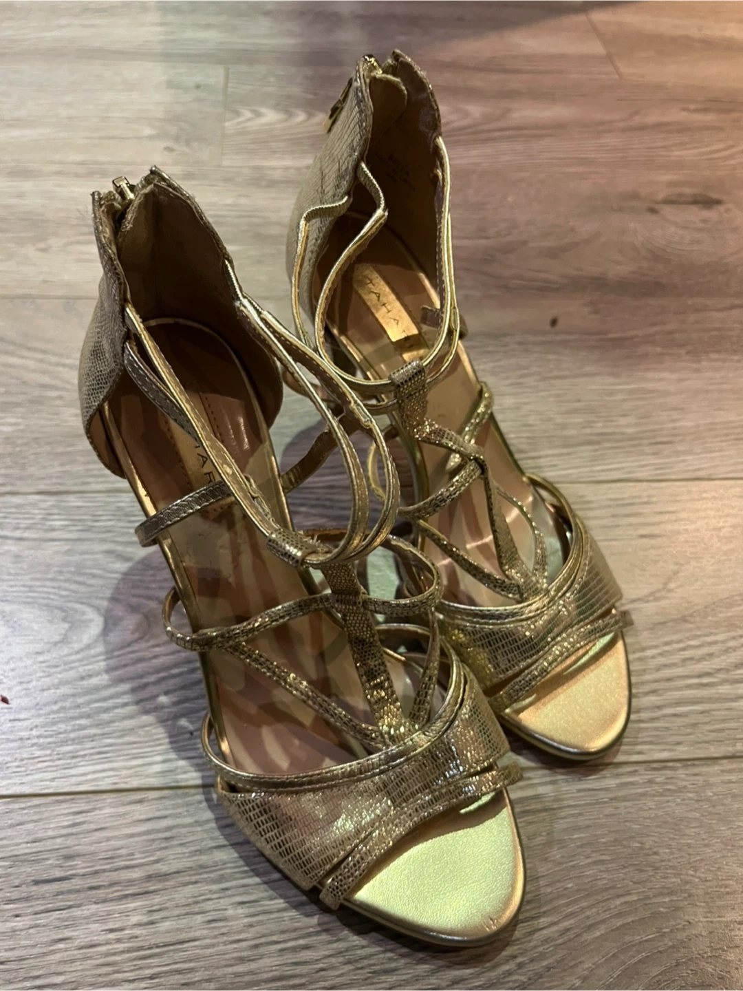 These are a pair of Tahari heels in gold. They are a size 7. They have a zipper in the back. They are in great condition!