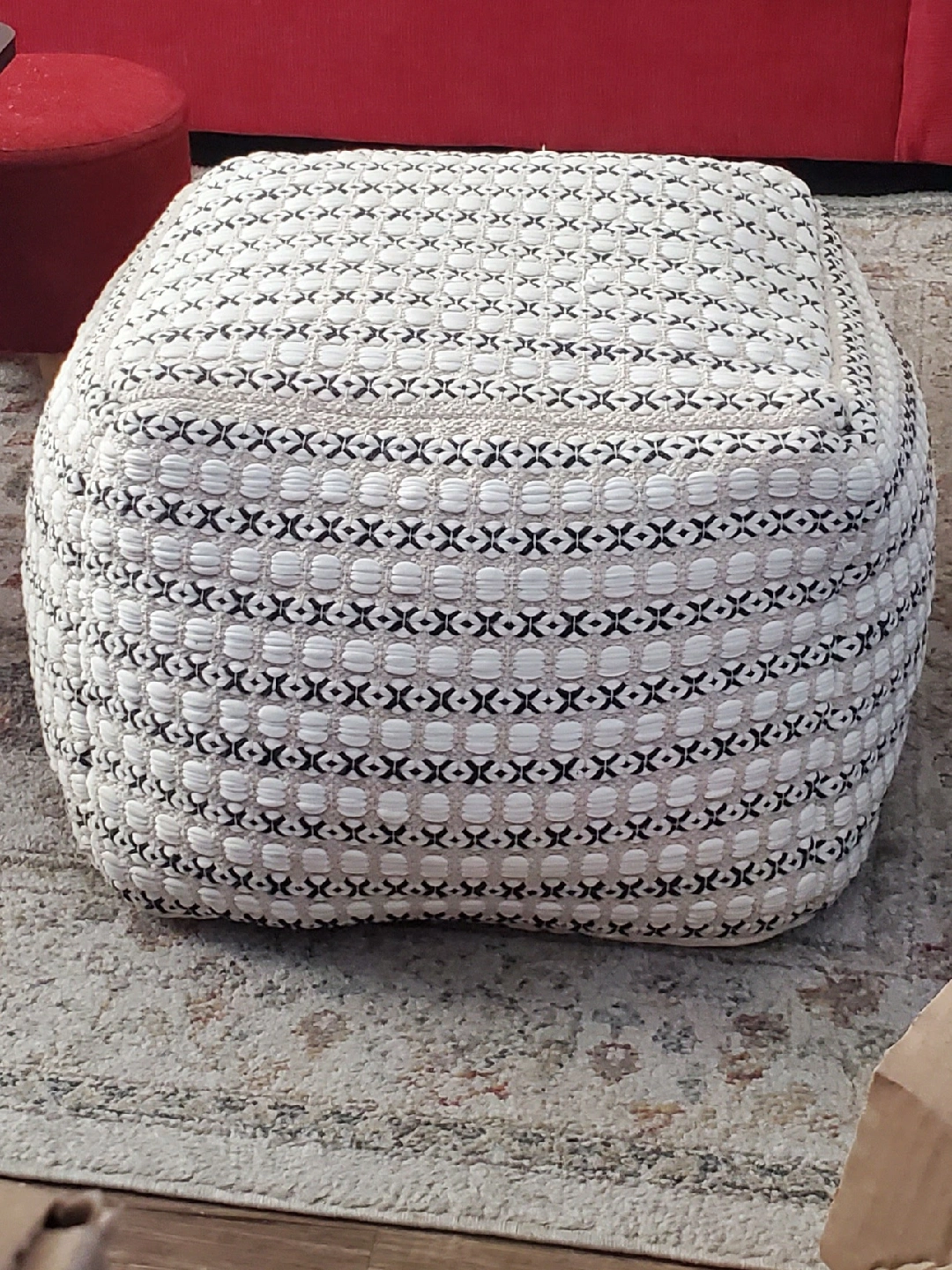 Selling a cute pouf ottoman with a woven pattern in cream and black. It's in great shape and would be a nice addition to any living room or bedroom. Cash only. Must pick up.