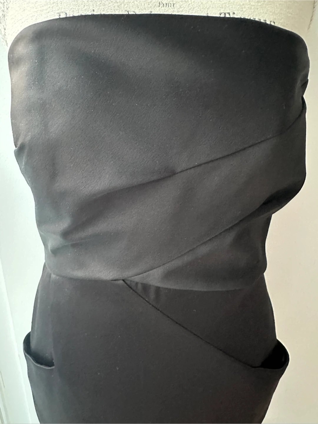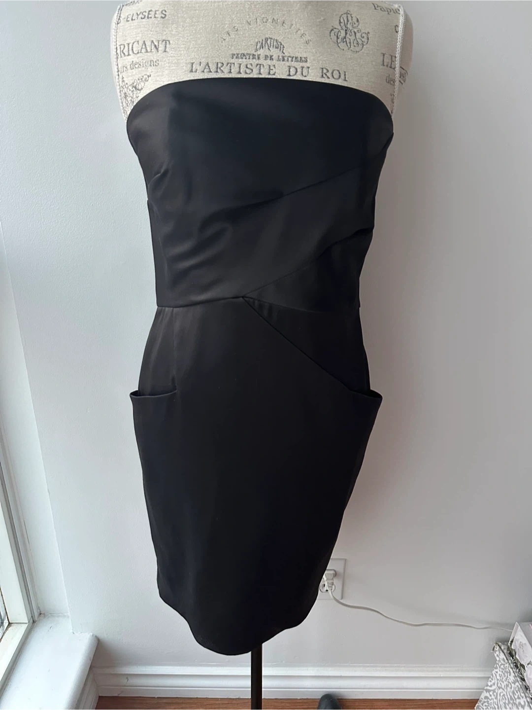 Selling a sleek black strapless dress! It features a unique design with pockets and boning on the sides. The dress is lined for extra comfort and shape. Perfect for a night out or a special occasion!