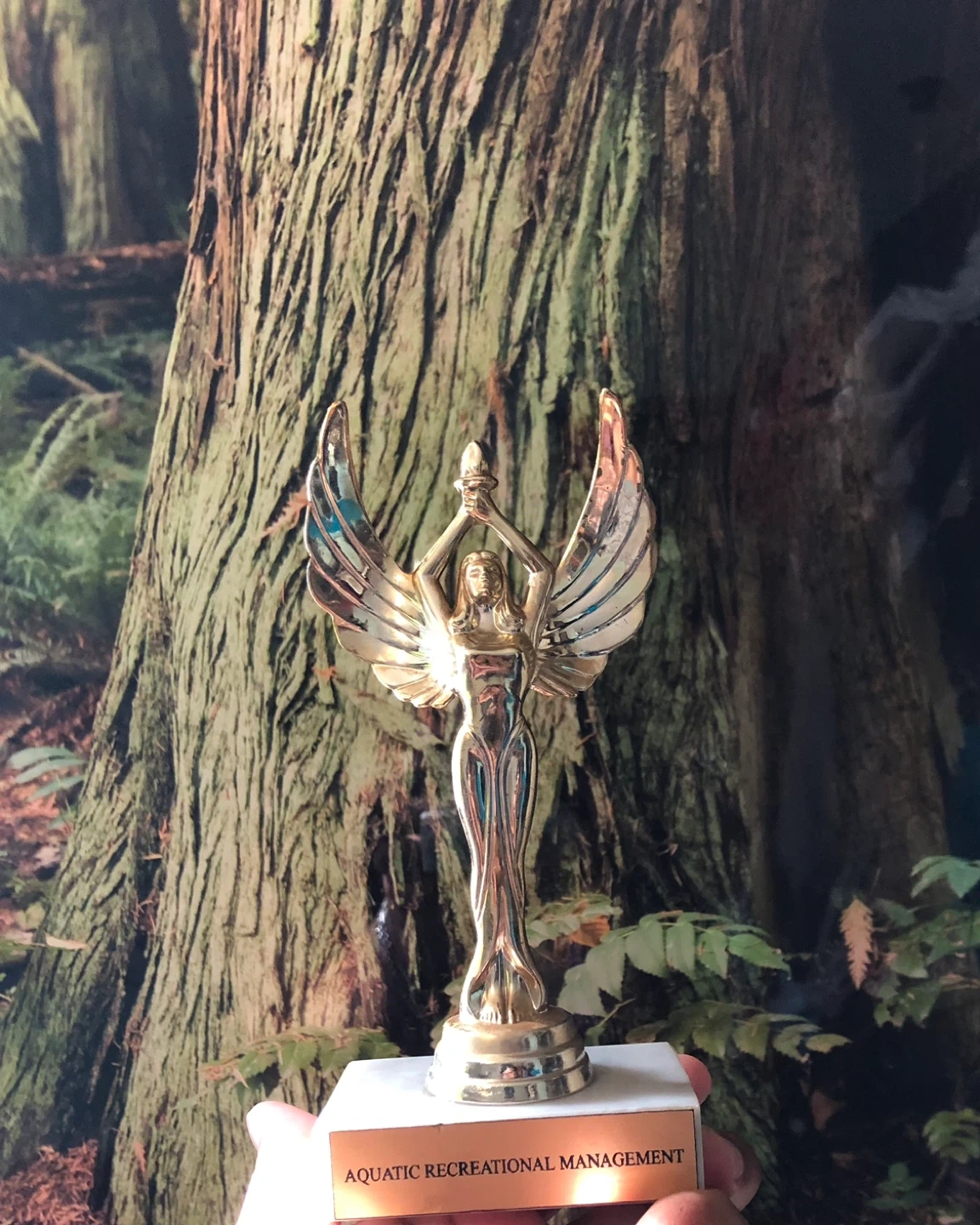 This is an Aquatic Recreational Management award. It features a golden winged figure on a white base. Would be a great addition to any collection or if you just want to give someone an award!