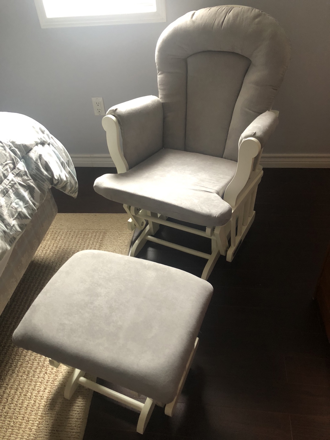 Selling a comfy glider rocking chair ottoman. It's in great shape and would be perfect for a nursery or any cozy space in your home. The soft grey colour is neutral and will fit in with any decor!