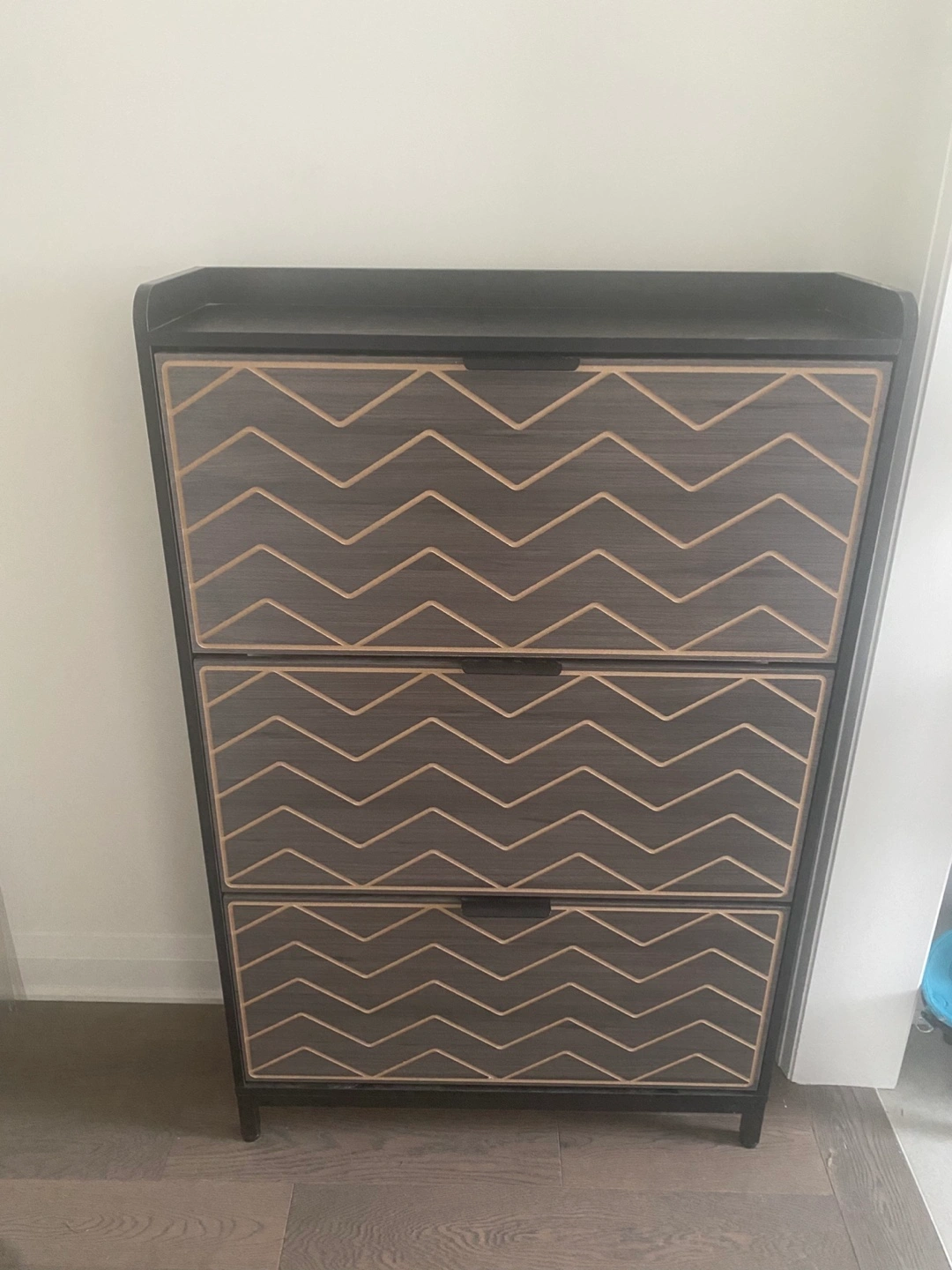 I'm selling a shoe storage cabinet. It's a stylish and functional piece for organizing your footwear collection. The cabinet features three drawers, providing ample space for storing shoes of various sizes. The unique design on the drawer fronts adds a touch of elegance to any room. It's in great condition and ready to find a new home!