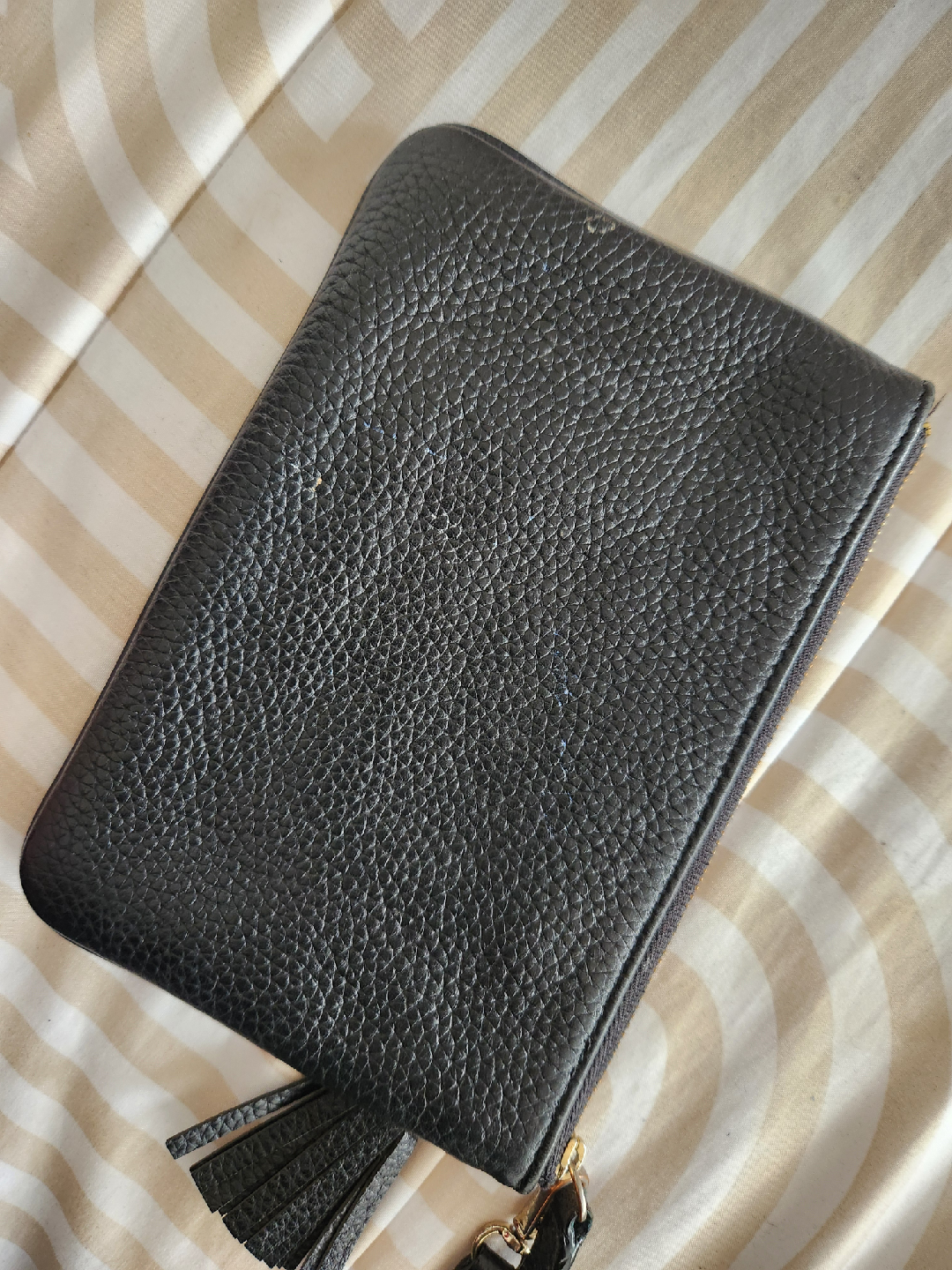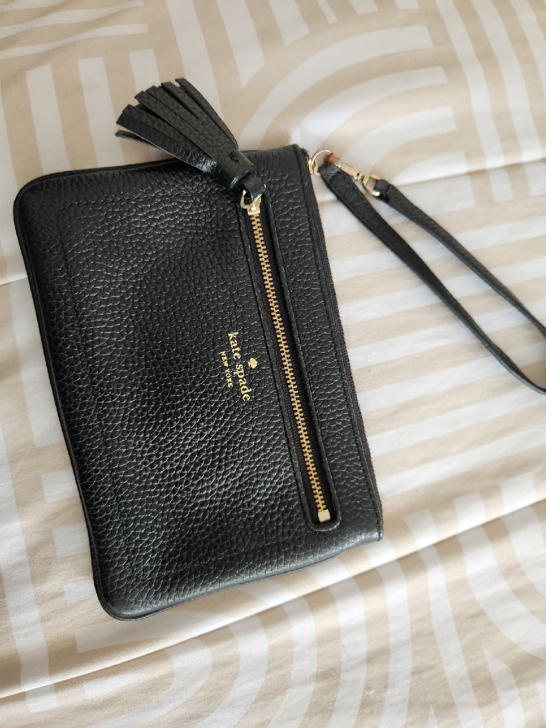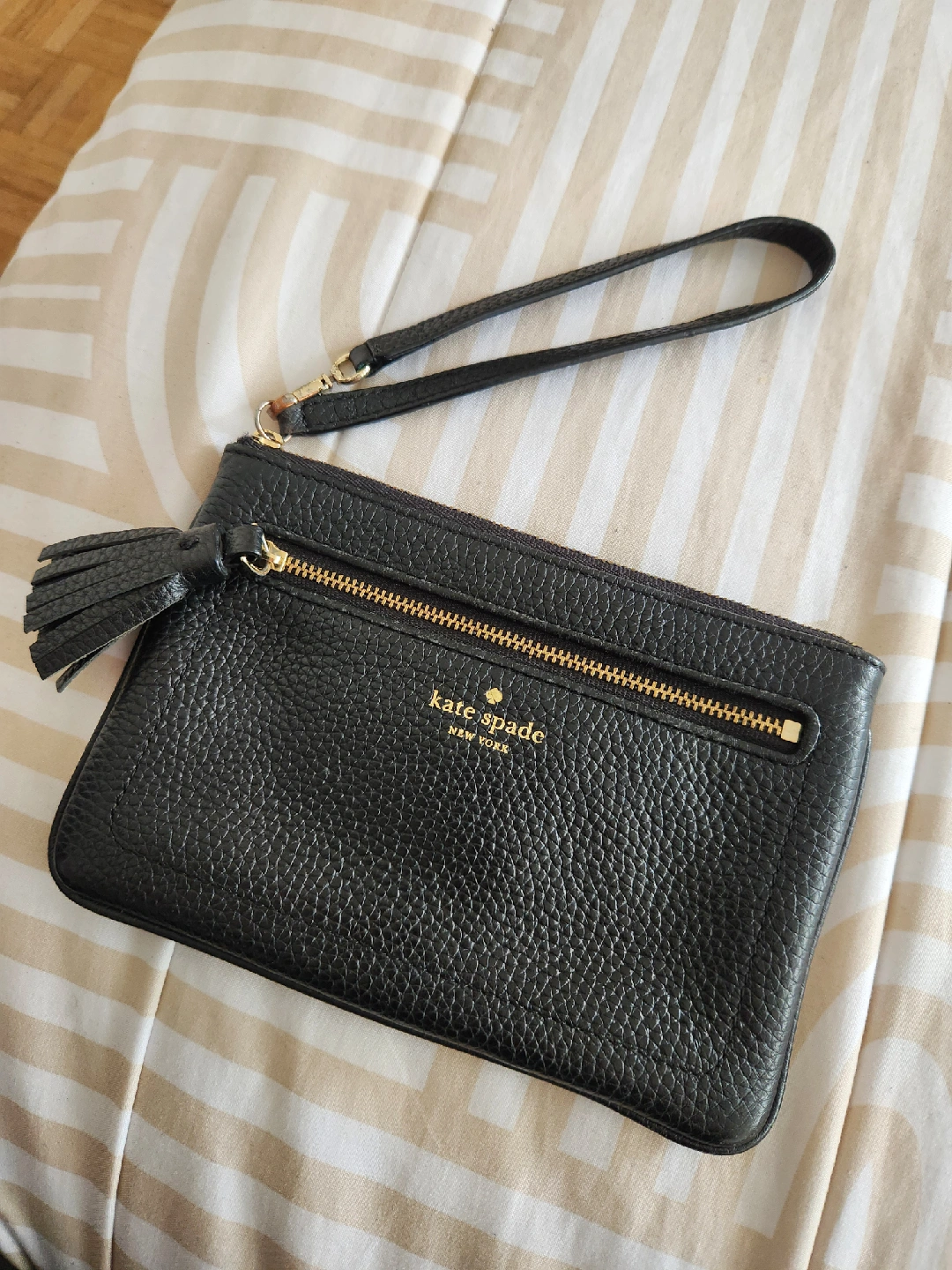 Selling a Kate Spade wristlet in black leather. It's in great condition and perfect for carrying essentials. Features a zip closure and a stylish tassel detail. A classic and versatile accessory!