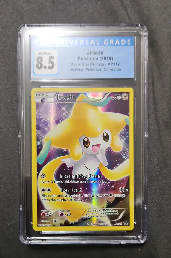 Selling a Jirachi Pokémon card from 2016. It's a Black Star Promo, XY112 from the Mythical Pokemon Collection. Card is graded NM/Mint+ at 8.5 by Universal Grade.