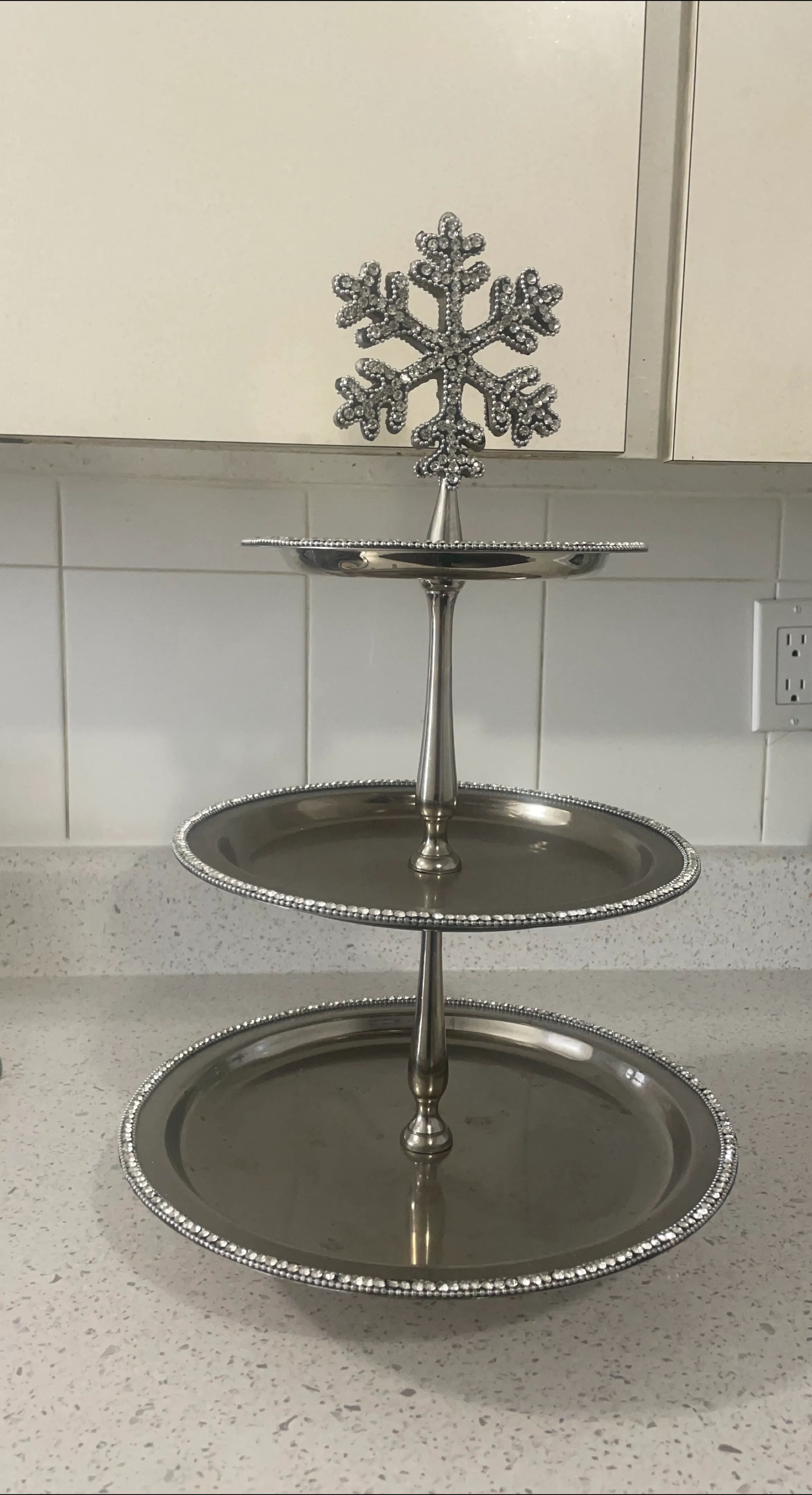 Selling a lovely silver-coloured 3-tiered serving tray! It has a decorative snowflake accent at the top. Perfect for displaying treats or appetizers at your next gathering