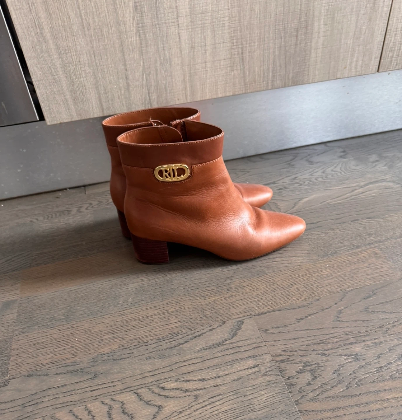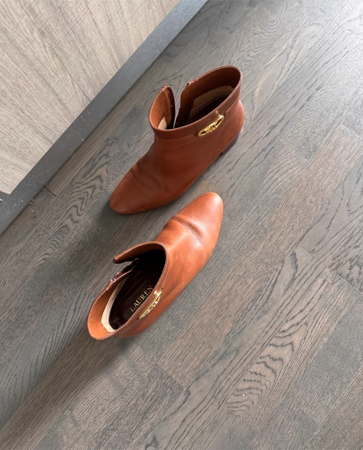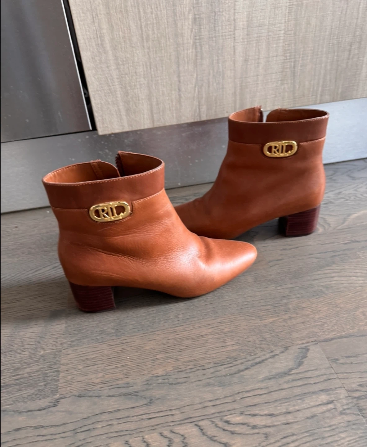 Selling a pair of Ralph Lauren ankle boots in brown leather! They feature the classic RL logo and a comfortable heel. Perfect for adding a touch of elegance to any outfit
