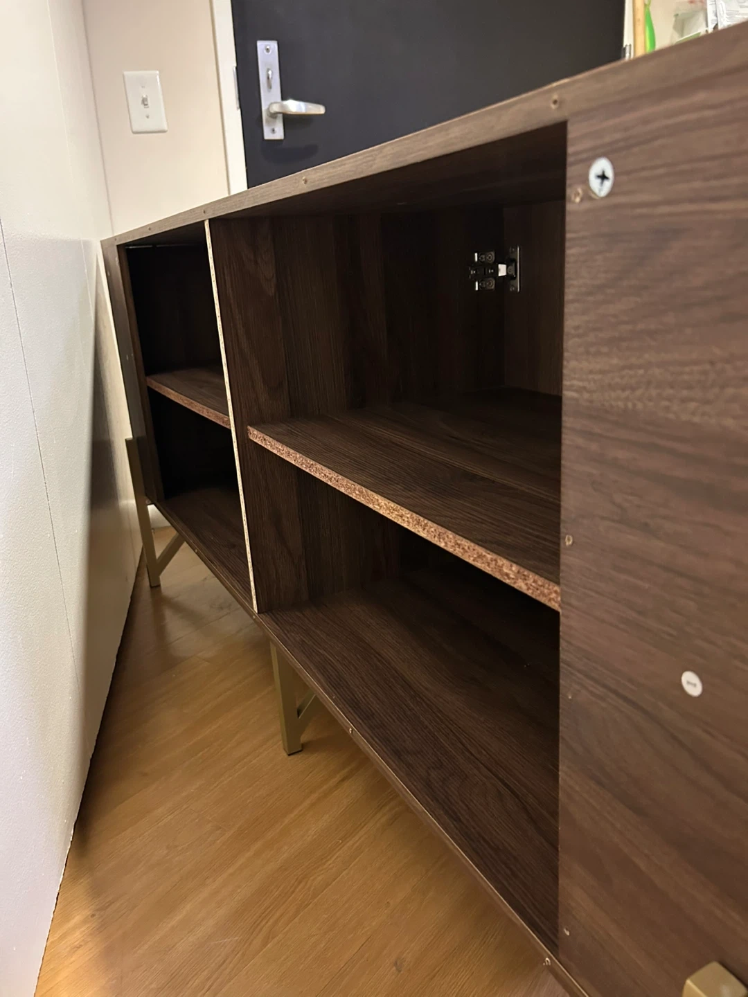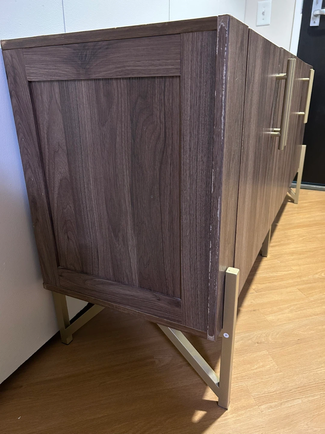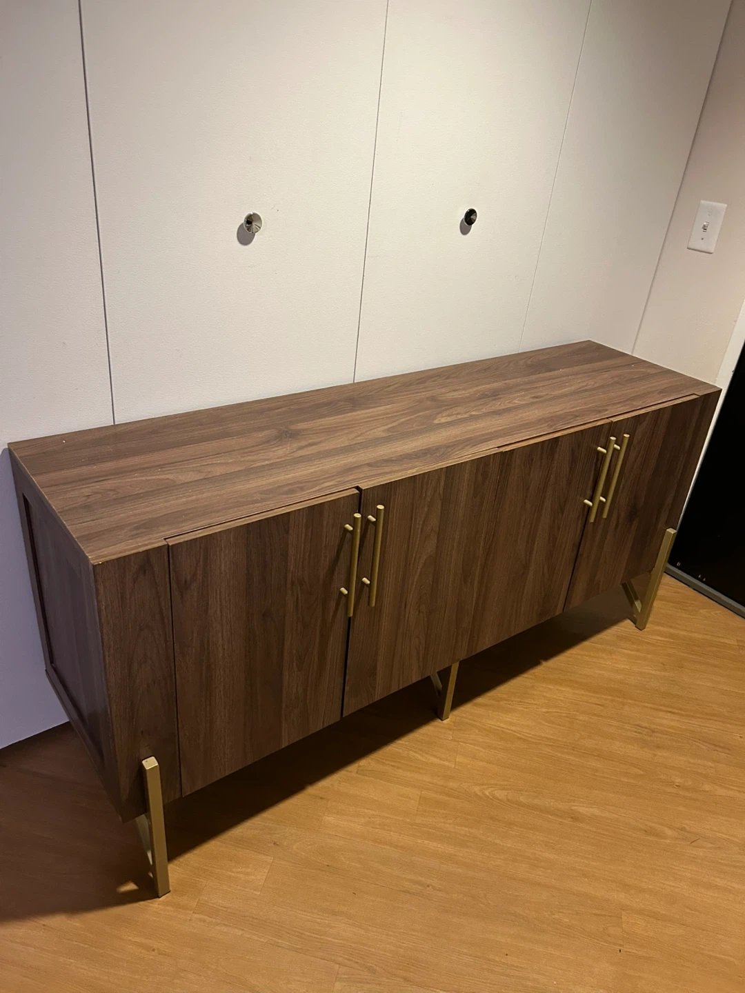 Selling a stylish brown wood cabinet that would look great in any room! It features gold accents on the handles and legs, adding a touch of elegance. The cabinet offers ample storage space with shelves inside. There are some minor signs of use on the top surface and the back of the cabinet is taken off because it fell apart.