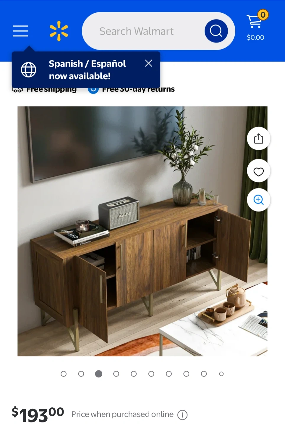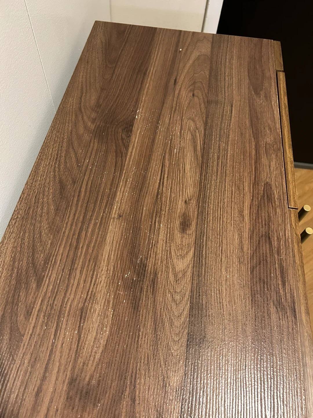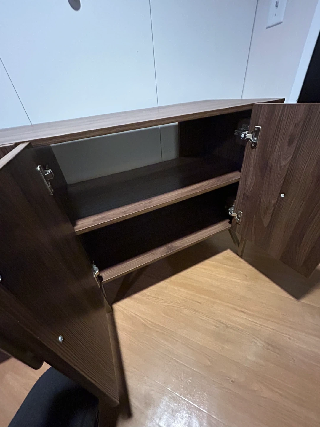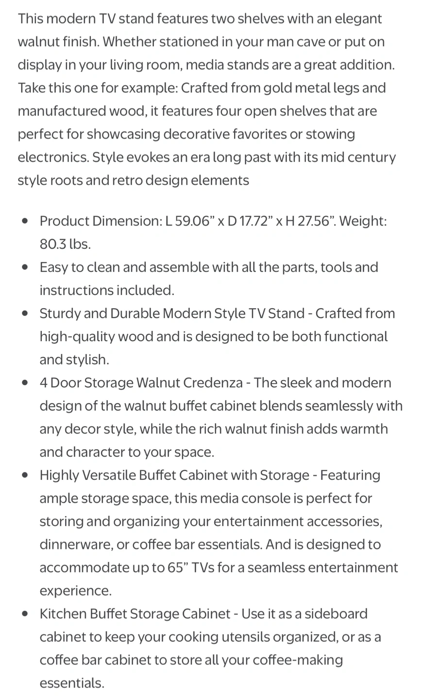Selling a stylish brown wood cabinet that would look great in any room! It features gold accents on the handles and legs, adding a touch of elegance. The cabinet offers ample storage space with shelves inside. There are some minor signs of use on the top surface and the back of the cabinet is taken off because it fell apart.