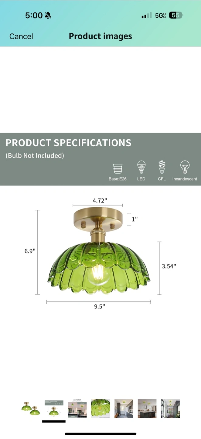NEW IN BOX The product specifications are: - Base: E26 - Dimensions: 6.9" height, 9.5" diameter - Bulb not included