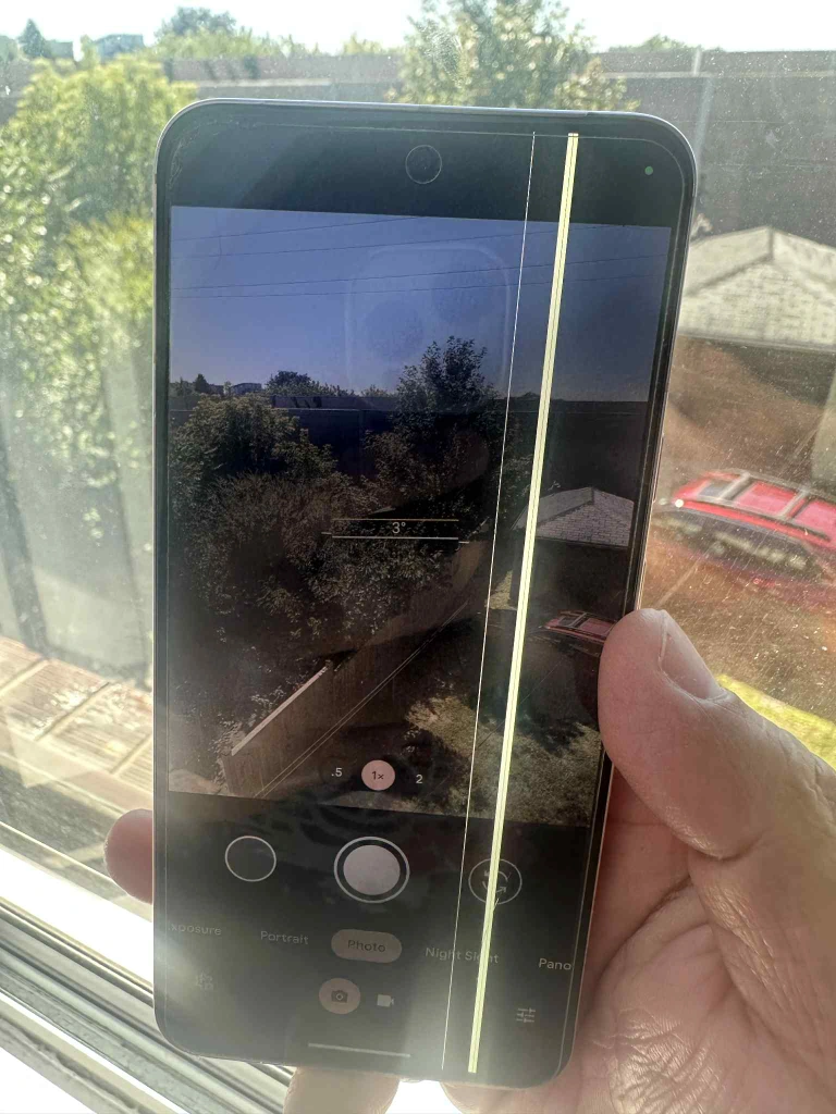 As you can see there’s lines in the screen but does not affect the performance. Camera is superb! This issue is pretty common on this pixel 8 models. Aside from that no cracks and breaks. The black in the camera is a protective tempered glass.