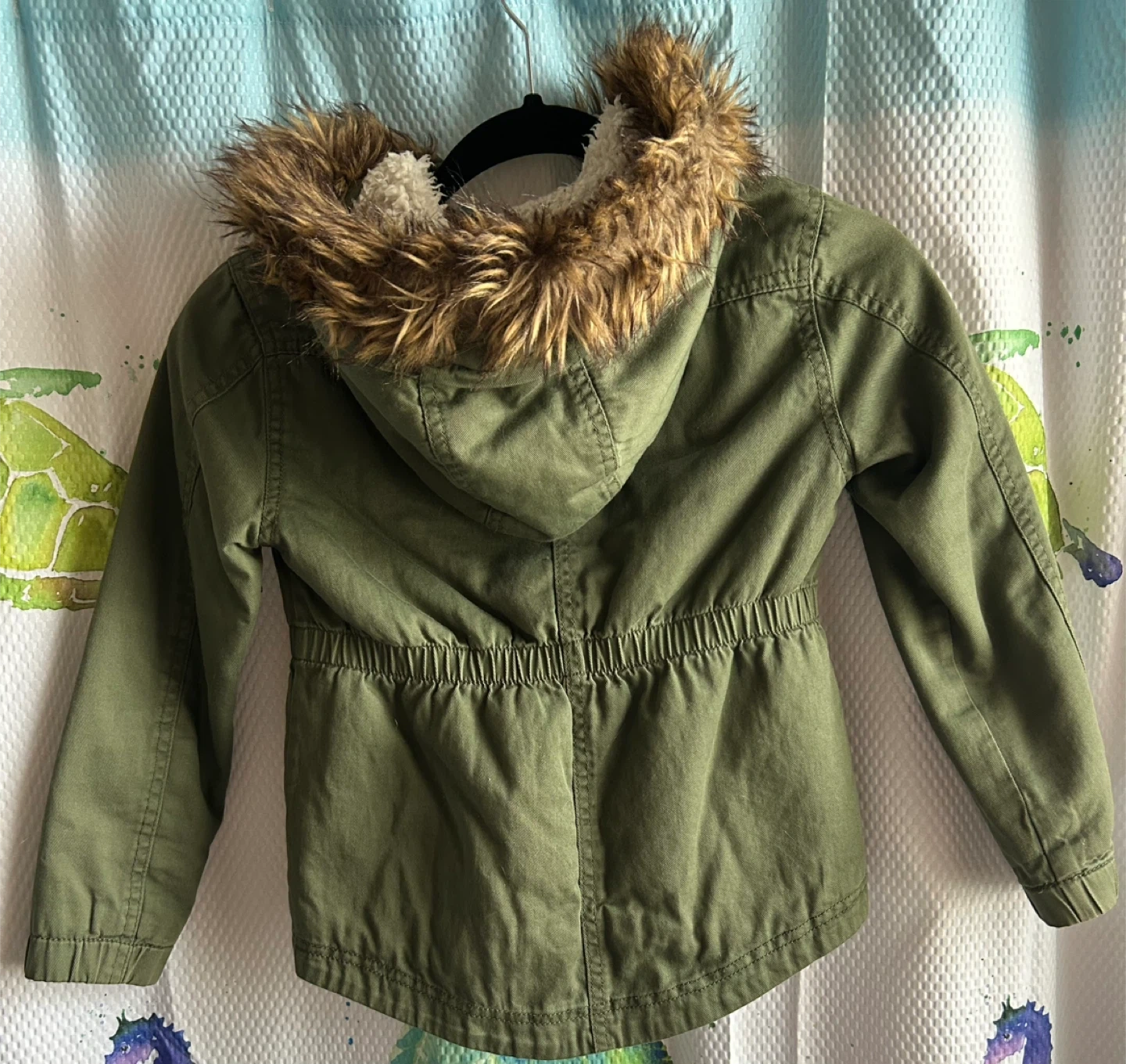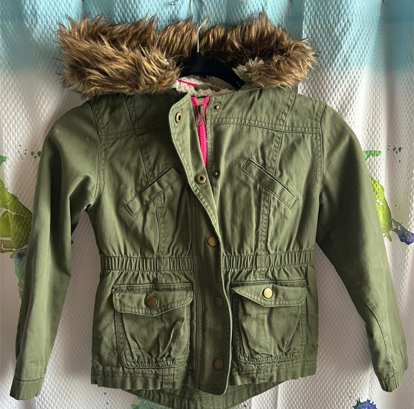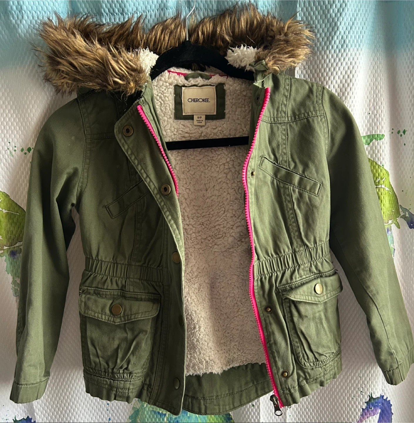 Selling gently used cute Cherokee girls' jacket in size S. It's an olive green color with a faux fur-trimmed hood and a pink zipper. Perfect for keeping your little one warm and stylish!