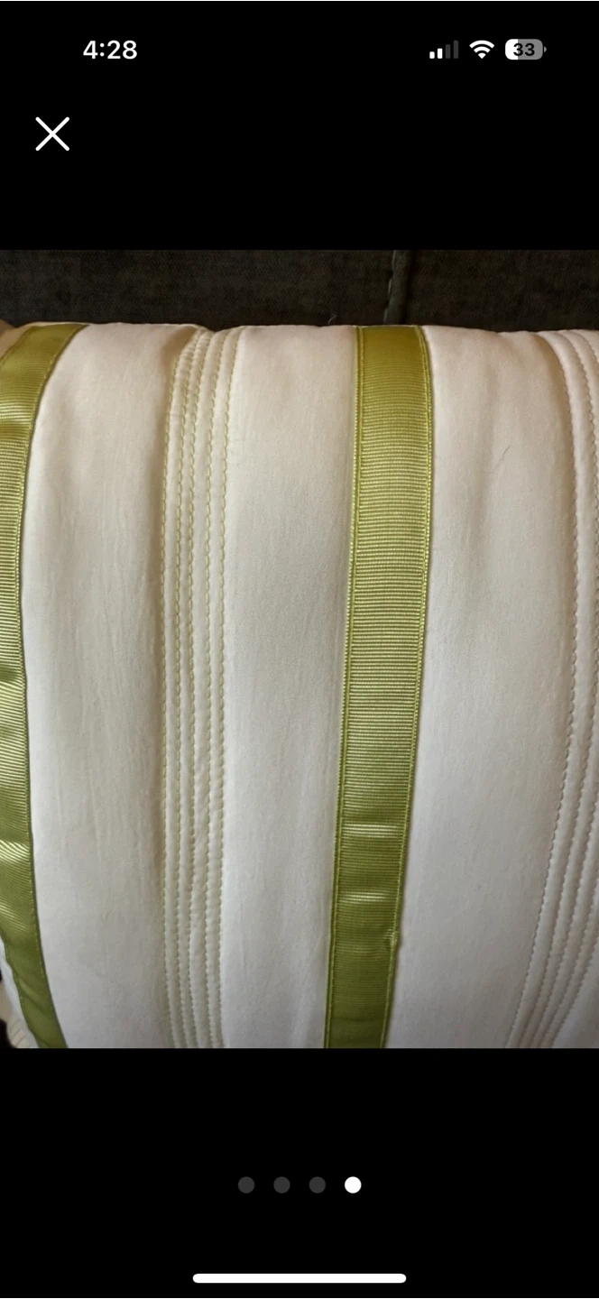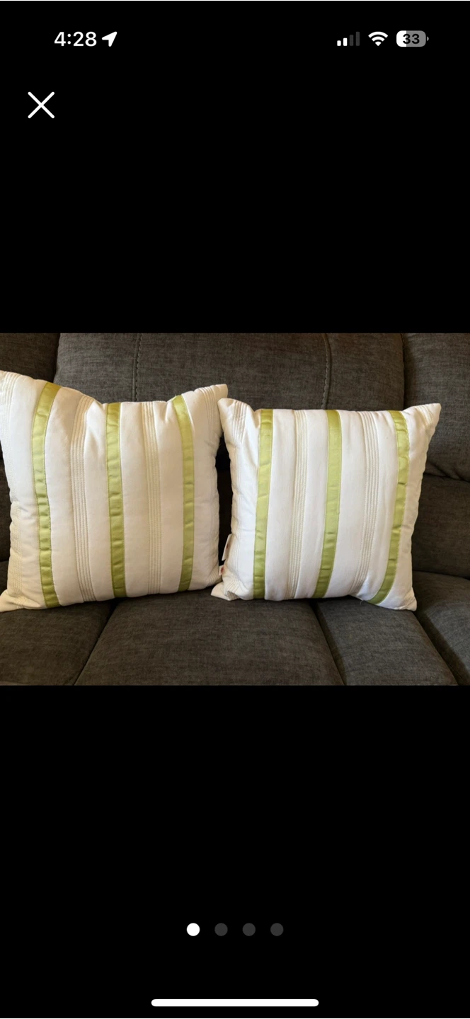 Selling a set of two decorative pillows from Springmaid. They feature a white base with vertical light green ribbon accents. These pillows are in great condition and would add a touch of elegance to any living space