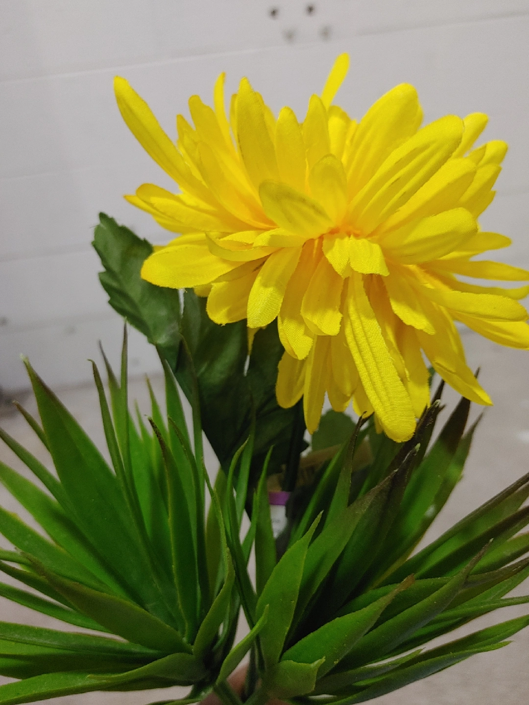 Here's a bright and cheerful artificial flower arrangement! The yellow flower and green foliage will add a pop of colour to any room. It's in great condition and ready to brighten up your space