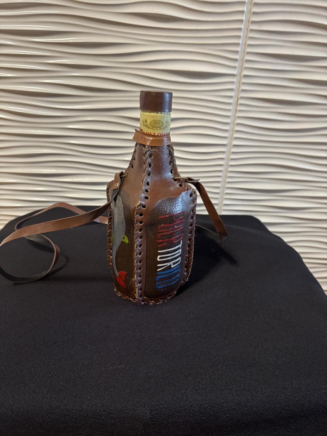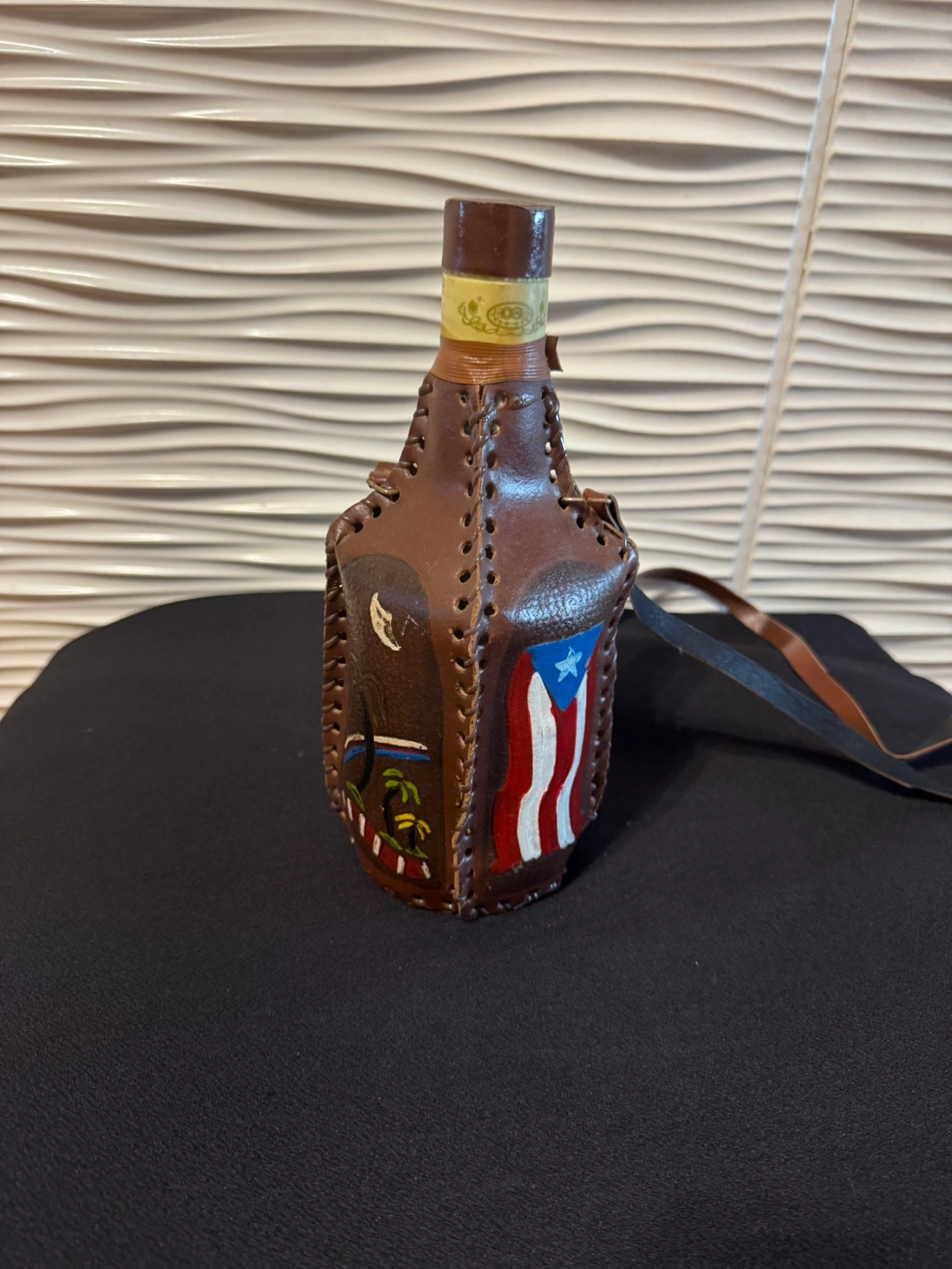 This vintage leather Puerto Rican bottle. It has a unique stitched detailing what appears to be a Puerto Rican flag and on the side the Puerto Rican name. It's a cool piece for decoration or display.