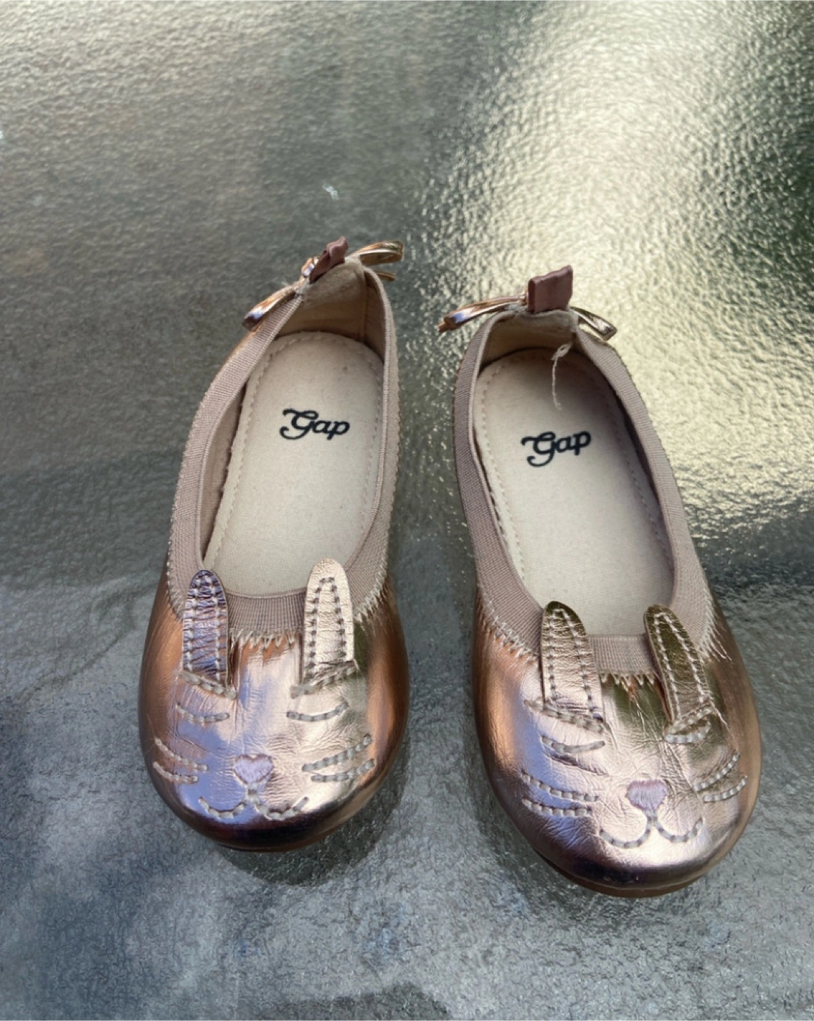 These are a pair of Gap Kids rose gold ballet flats with adorable bunny detailing, perfect for your little one! These shoes are in good condition and ready for a new home. They have a cute bow at the back.