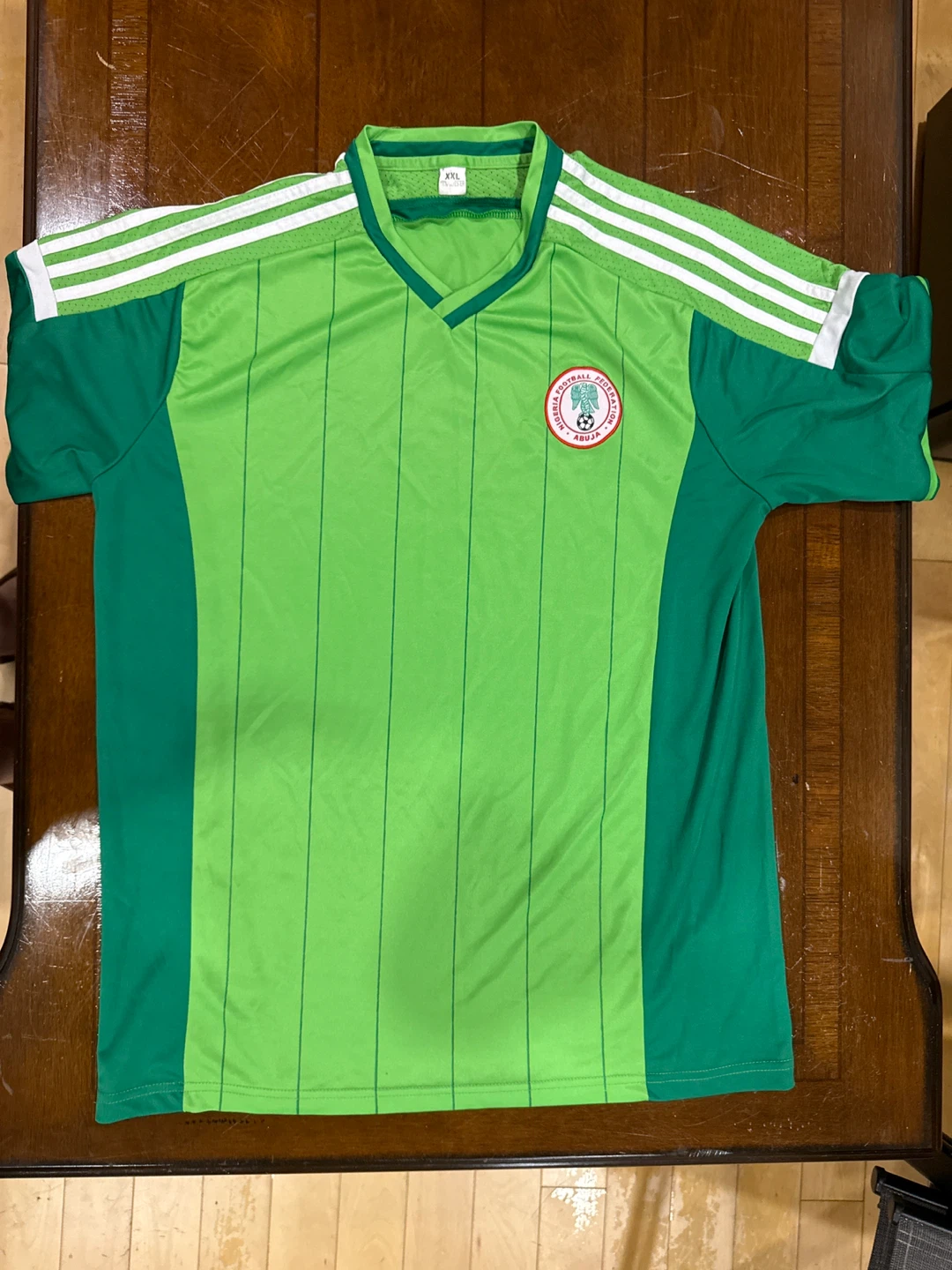 Selling an Adidas Nigeria football jersey in size XXL. The jersey is green and white with the Nigeria Football Federation logo. It's made of 100% polyester and in good condition. Great for any football fan!