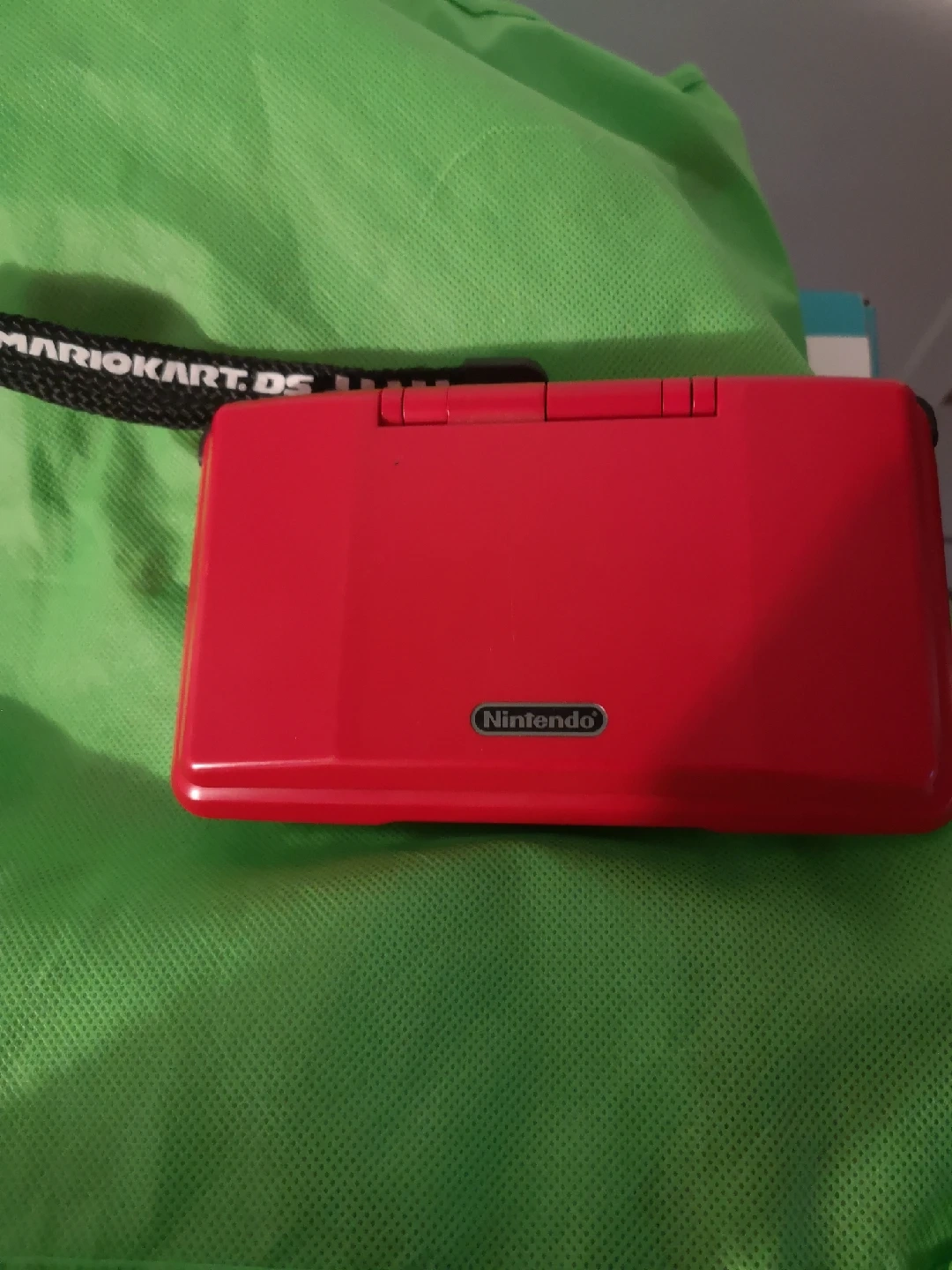 Selling a red Nintendo DS handheld console! It's in good condition and ready for a new home. Perfect for playing your favourite DS games on the go. Comes with a Mario Kart DS wrist strap!