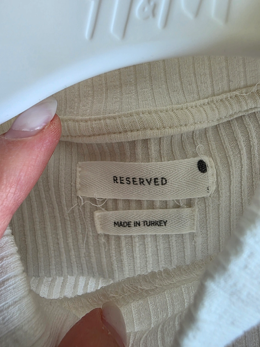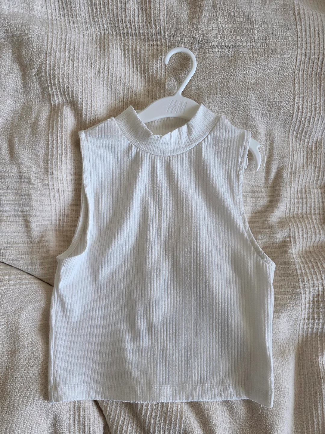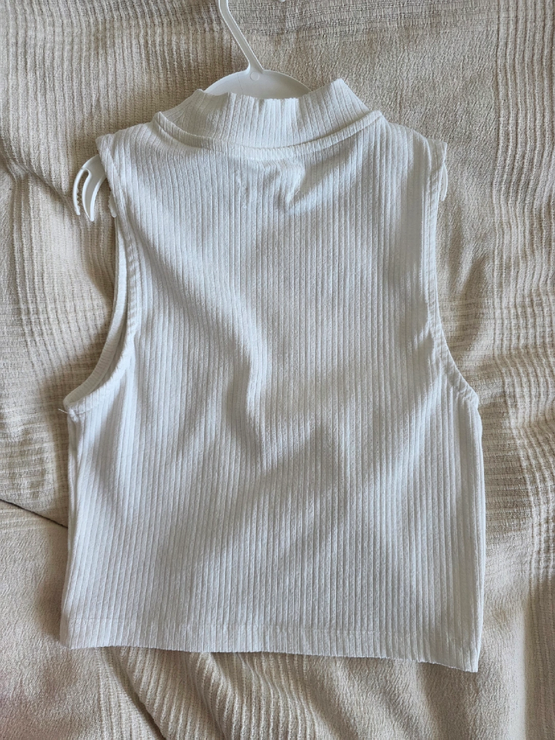 Reserved ribbed sleeveless crop top in white. Features a mock neck and stretchy fabric for a comfortable fit. Simple and versatile, perfect for layering or casual wear. Size S.