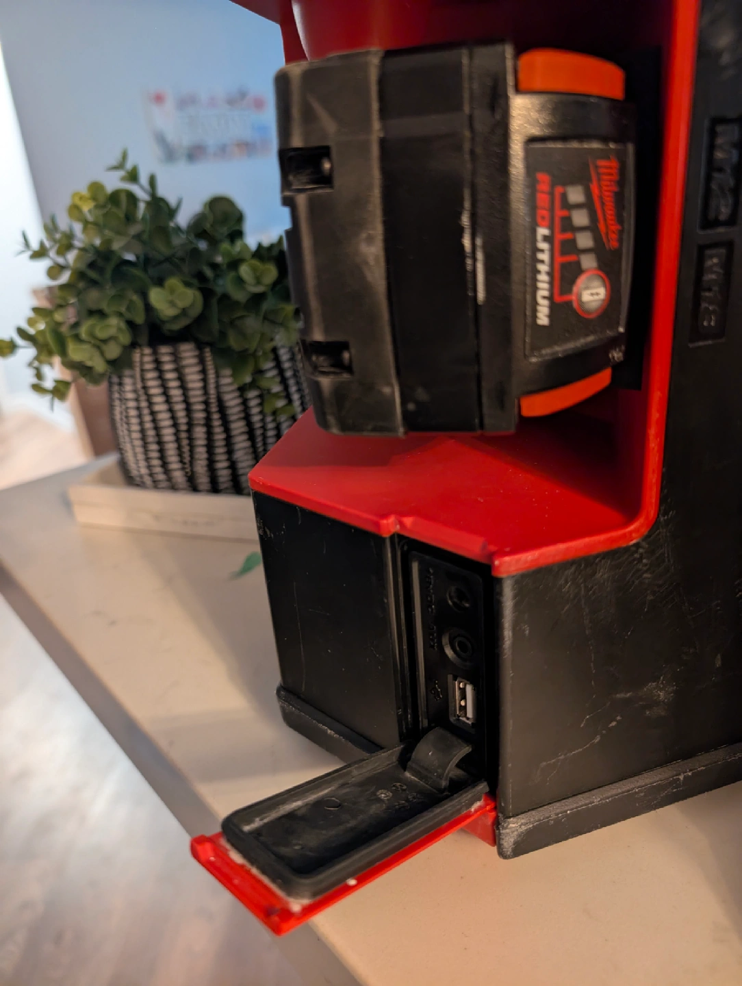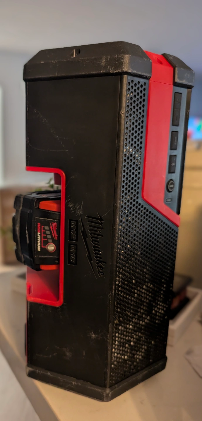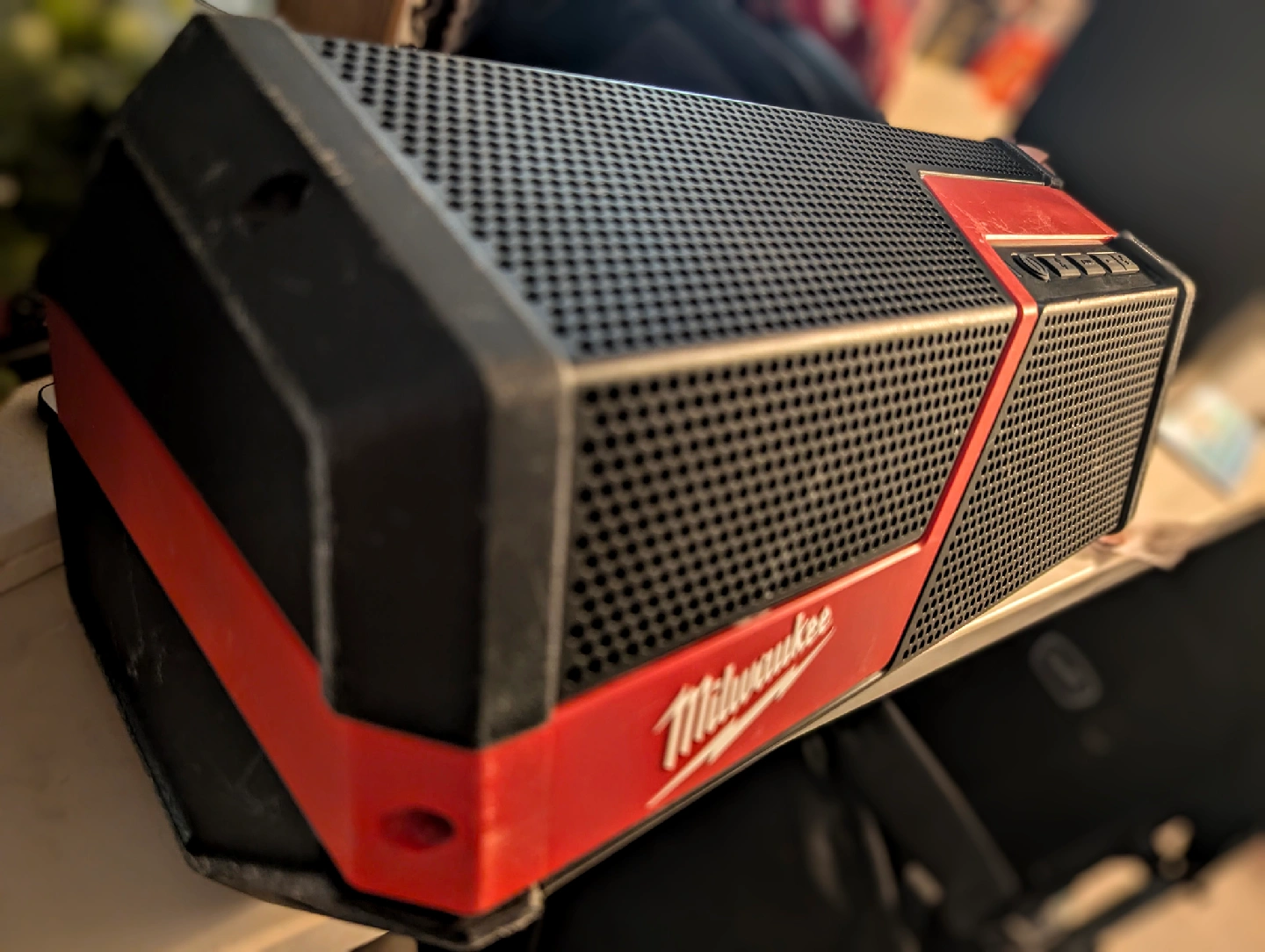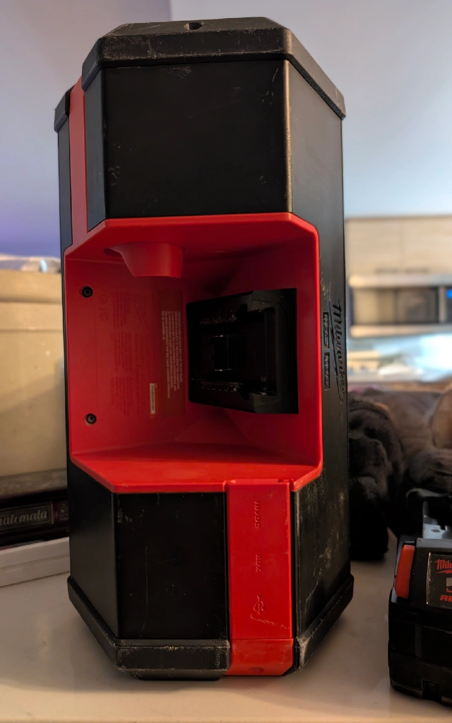 Used in various jobsites, cosmetic is 7/10, it is thoroughly cleaned and disinfected ready for next owner. Works like new. quick connection to bluetooth. Can use M12 or M18 batteries (Not included). charge phone while listening to music.