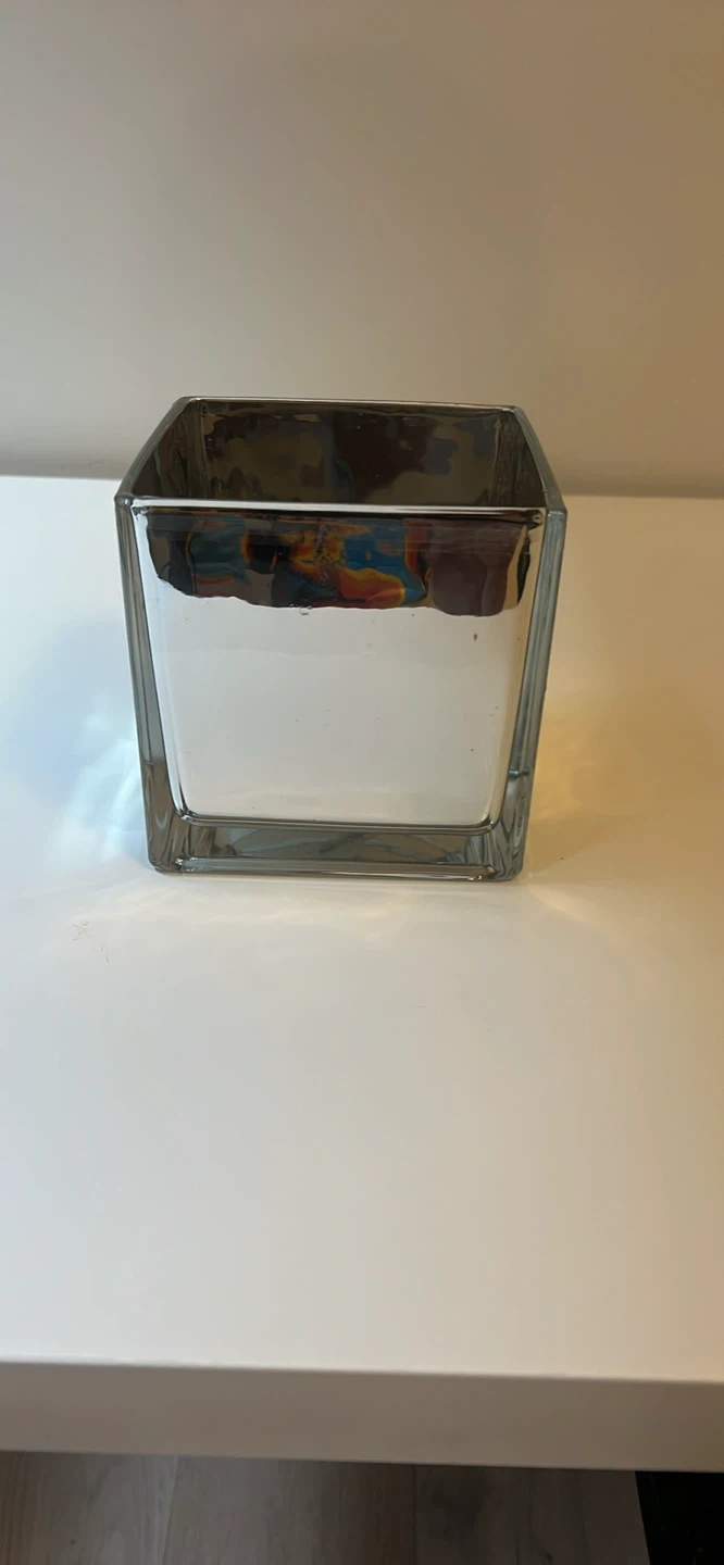 Selling a square glass vase with a silver finish! Perfect for flowers or as a decorative piece for your home