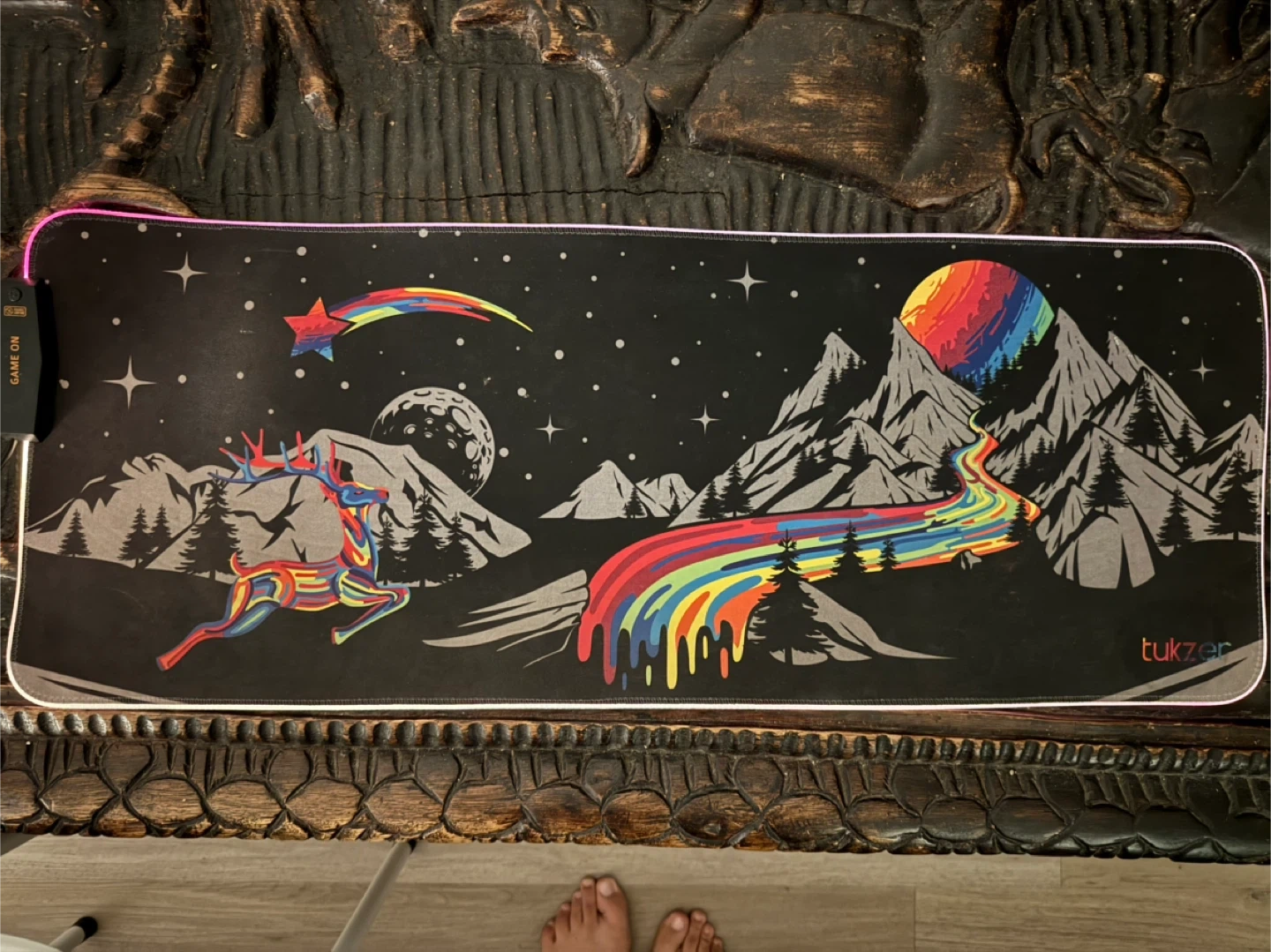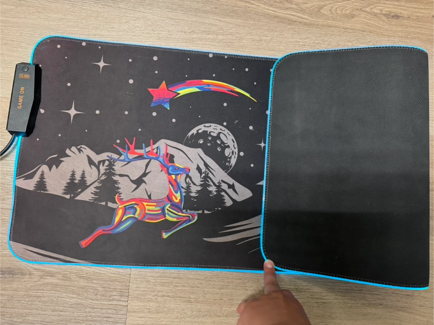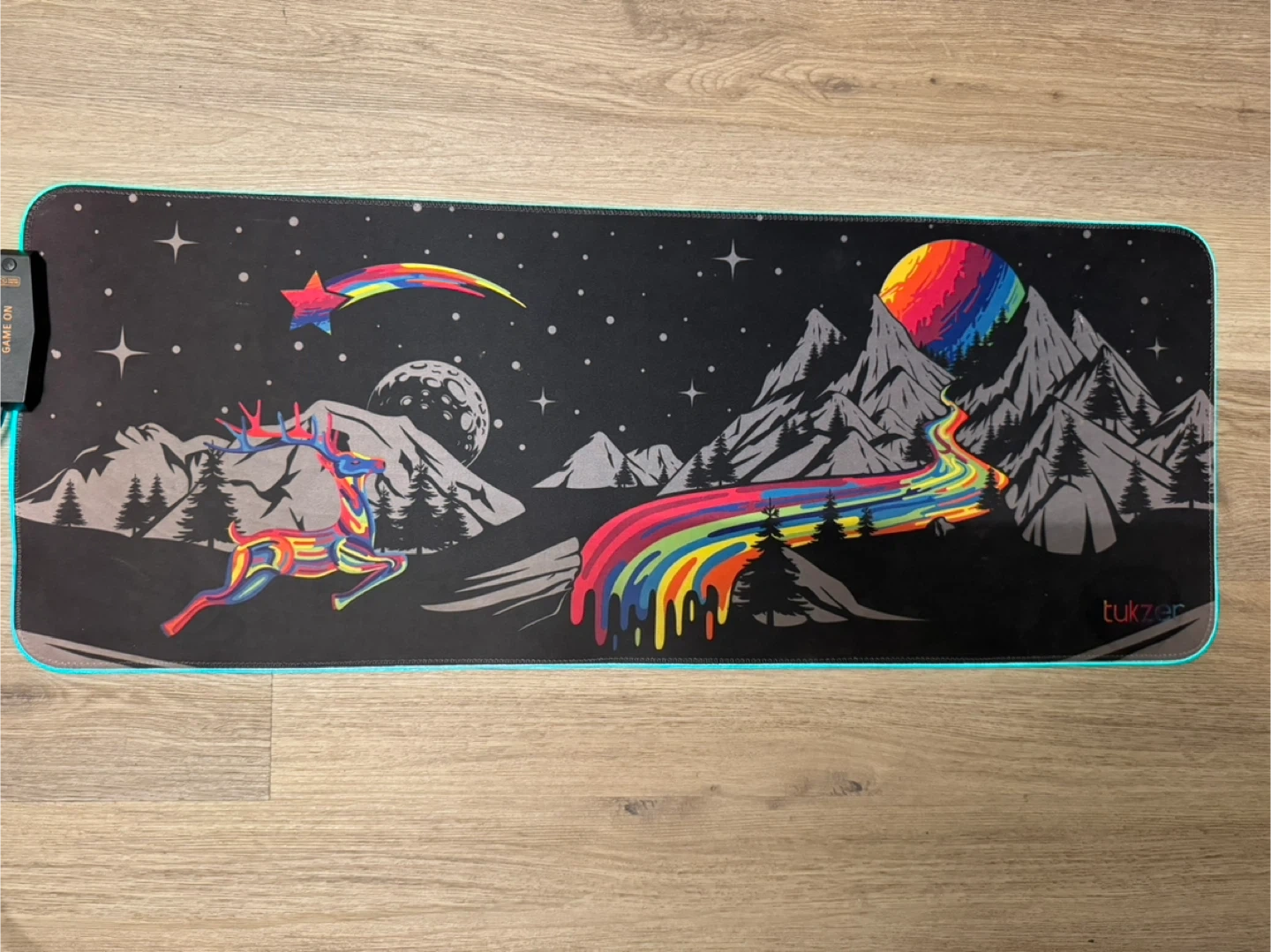 Check out this RGB gaming mouse pad! It's got a cool design with a rainbow and stars, and the edges light up. It also has a USB hub built in, so you can plug in your other devices right on your desk. It is non slippery. Perfect for your gaming setup.