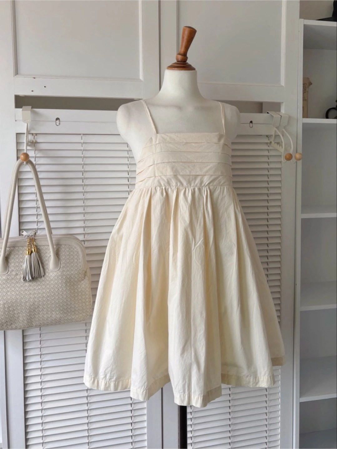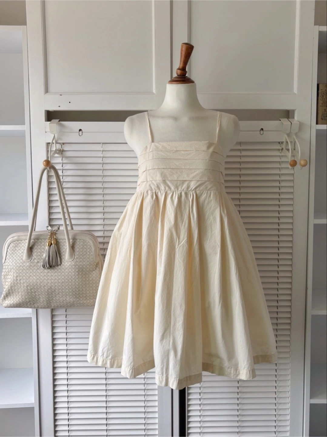 A charming vintage sleeveless dress featuring a feminine fit-and-flare silhouette with adjustable spaghetti straps and a lightly pleated bodice. The dress has a structured waistline with elastic at the back for comfort and a flared skirt that moves beautifully. Perfect for summer outings, casual cottagecore styling, picnics, or pairing with a cardigan for a retro-inspired party look.