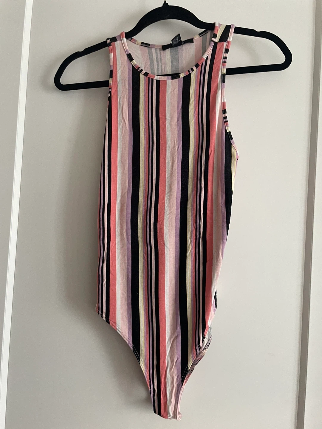Selling a cute Forever 21 striped bodysuit! It's a size small and features vertical stripes in black, coral, lavender, and white. Perfect for layering or wearing on its own!