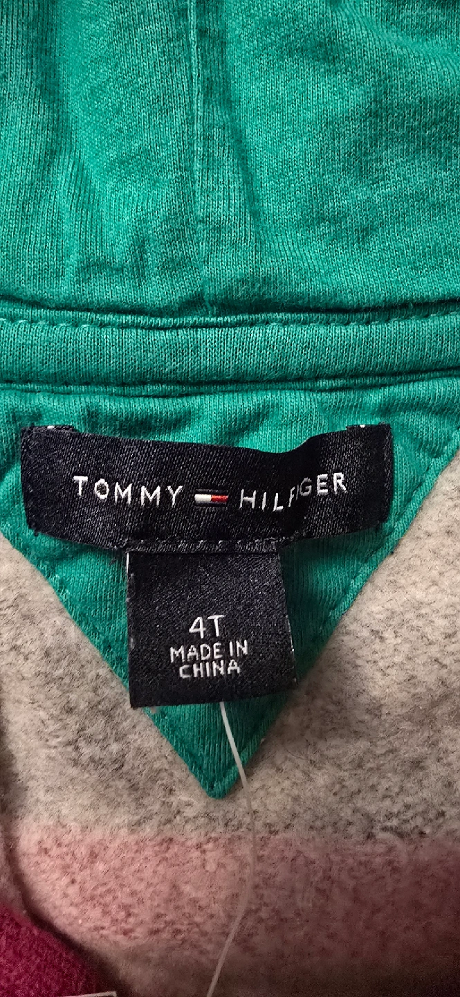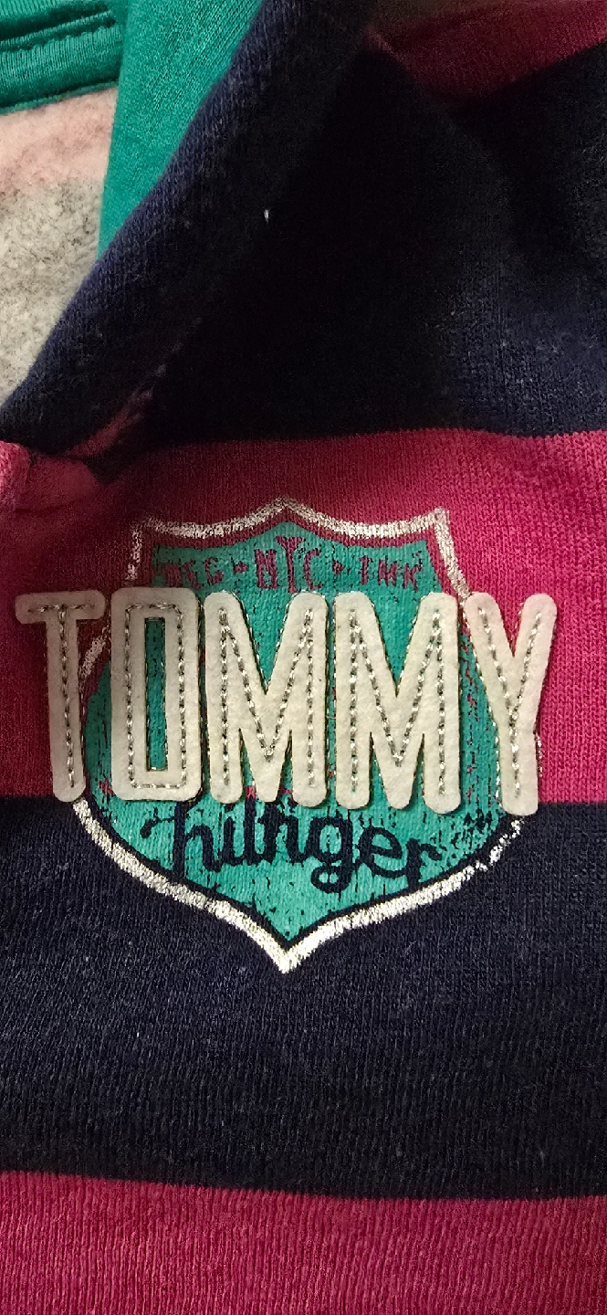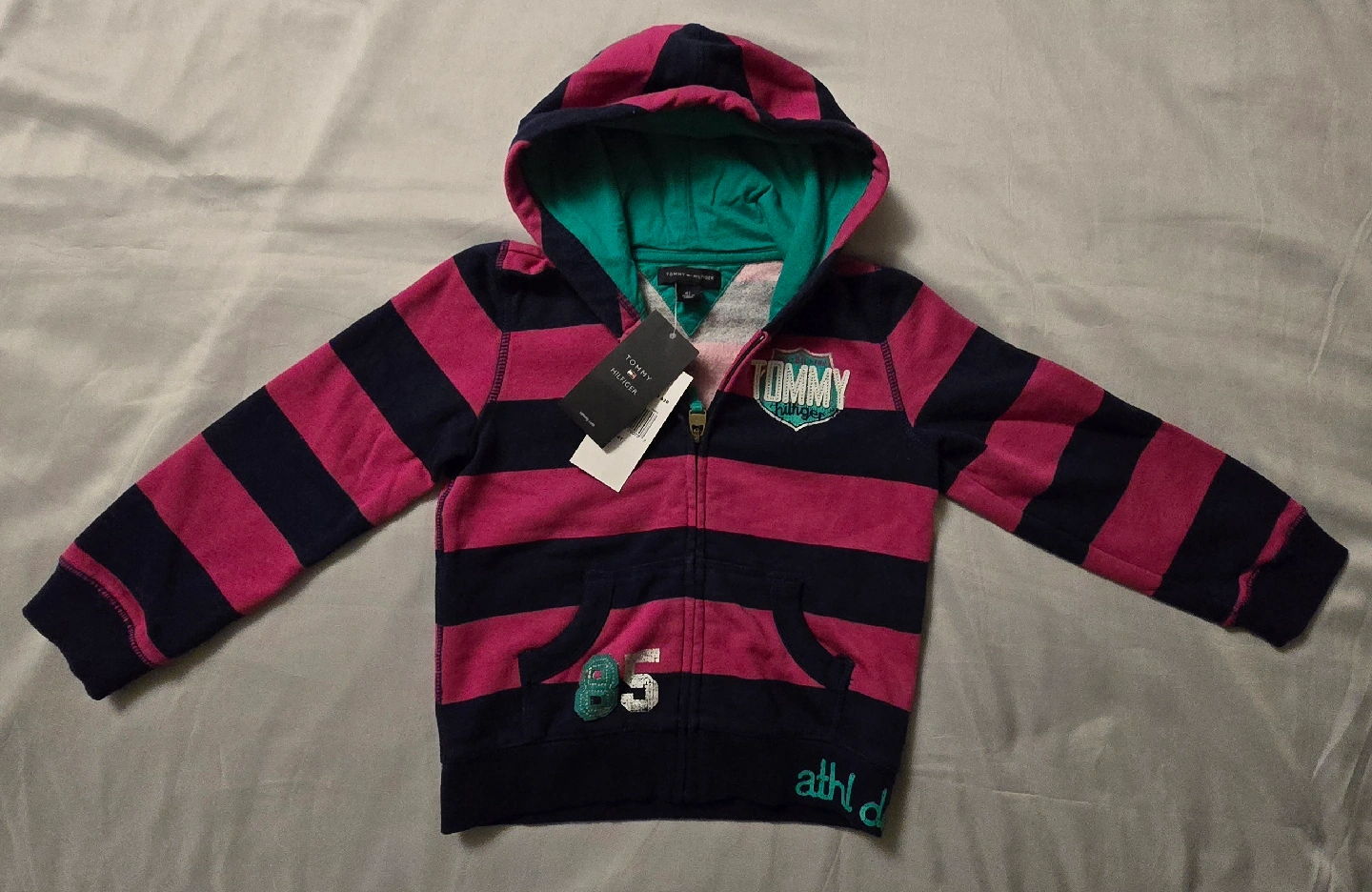 BRAND NEW with tags! Authentic Tommy Hilfiger girls zip-up hoodie featuring a striped design in pink and navy. The hoodie has a front zipper, pockets, and a hood with a green lining. Nice & Warm! It also has a Tommy Hilfiger logo on the front!