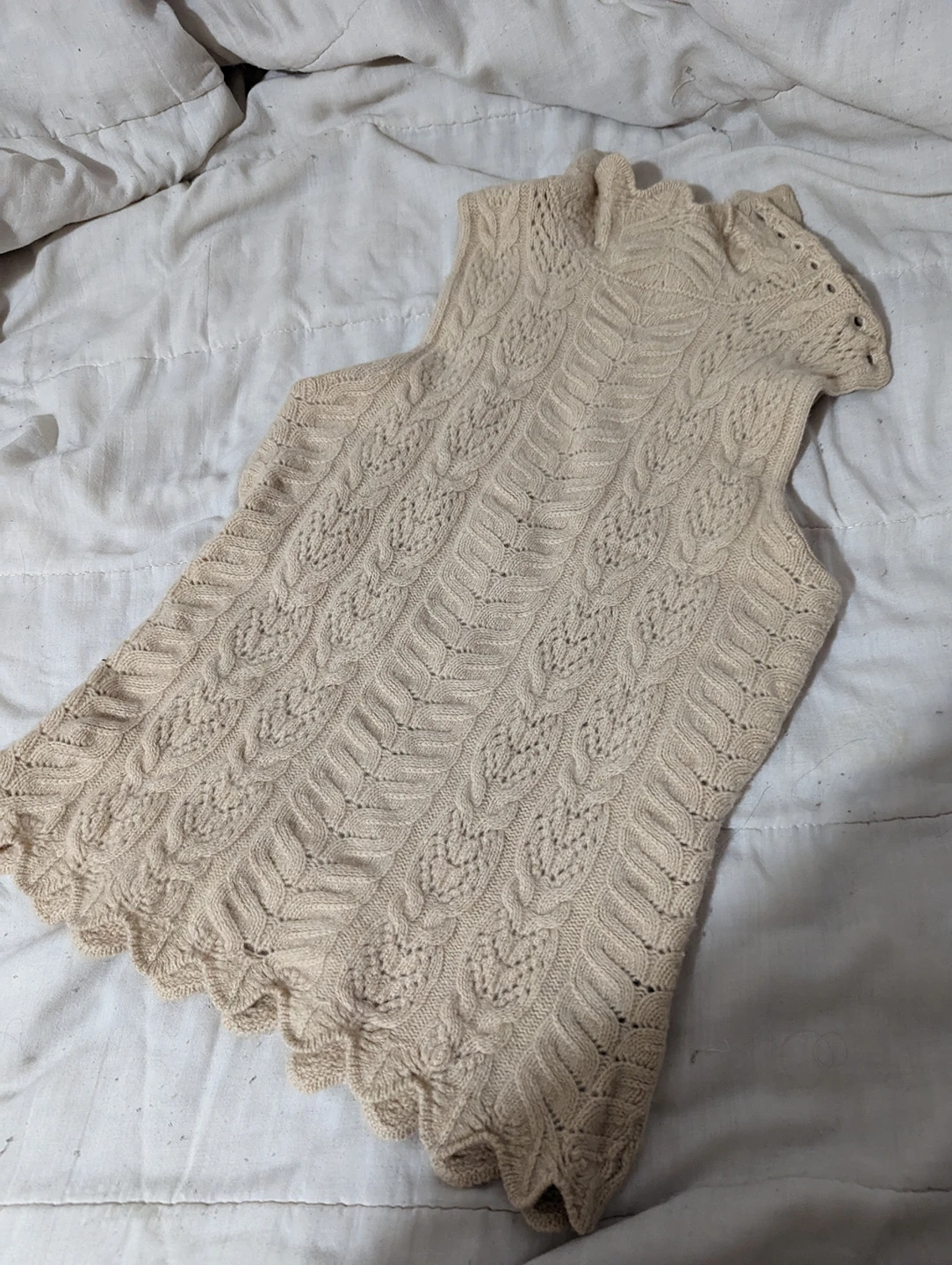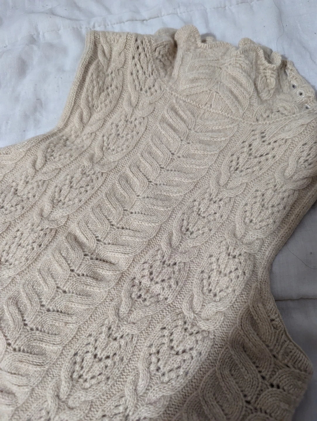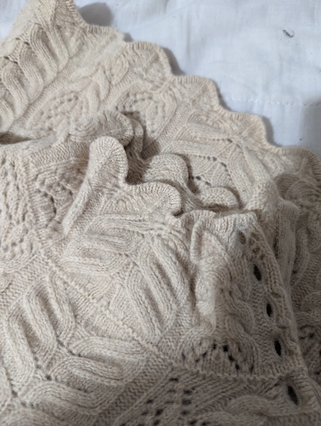 Beautiful beige/light brown top w scalloped neck and bottom. You button along the neck/shoulder on one side.