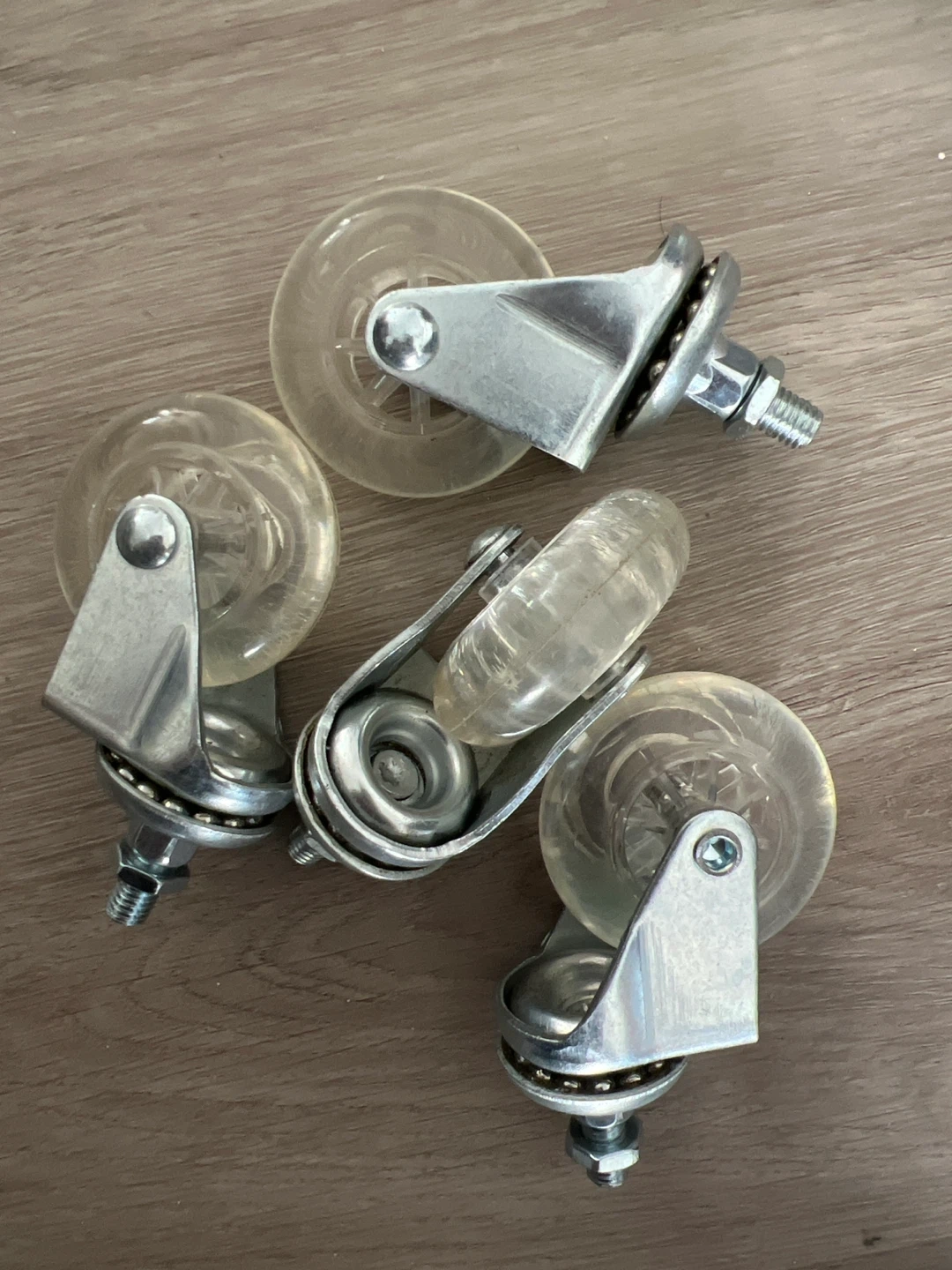 Selling a set of four caster wheels! They have a clear wheel and silver hardware. Great for adding mobility to furniture or other projects. One of them has loose ball bearing othering its new.
