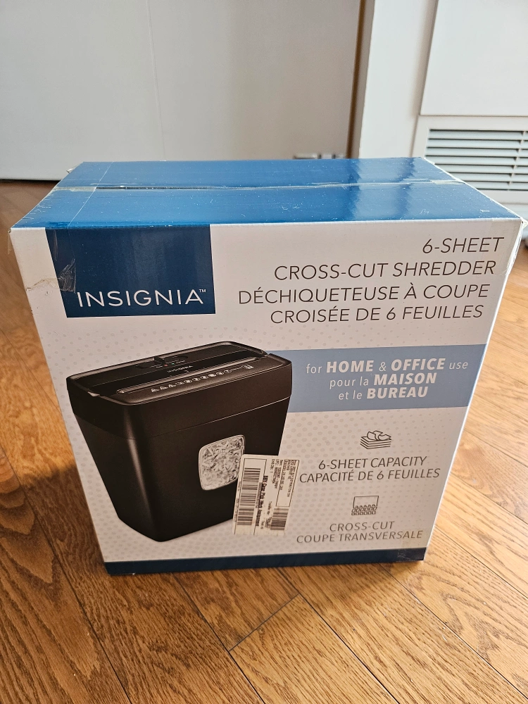 Selling a brand new Insignia 6-Sheet Cross-Cut Shredder! It's still in the box and ready for a new home. This shredder is perfect for home and office use. The box includes a Quick Setup Guide. It shreds paper, staples, and credit cards.