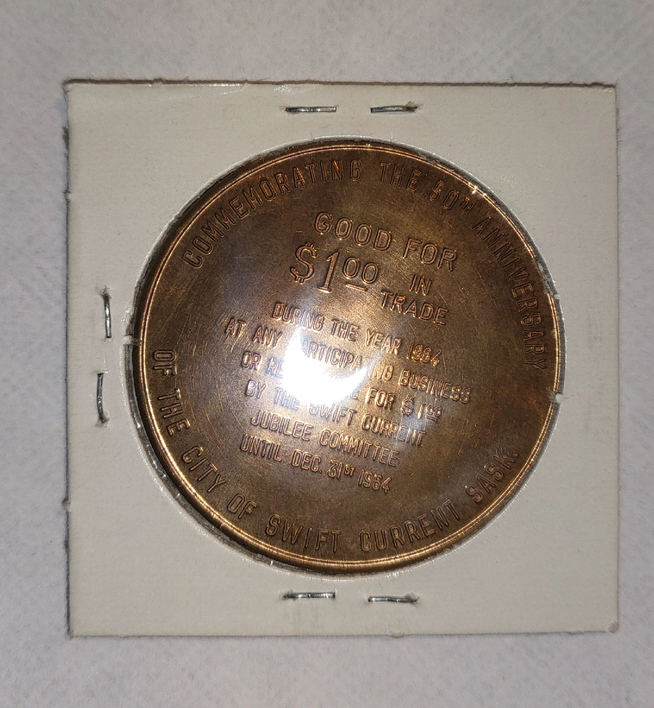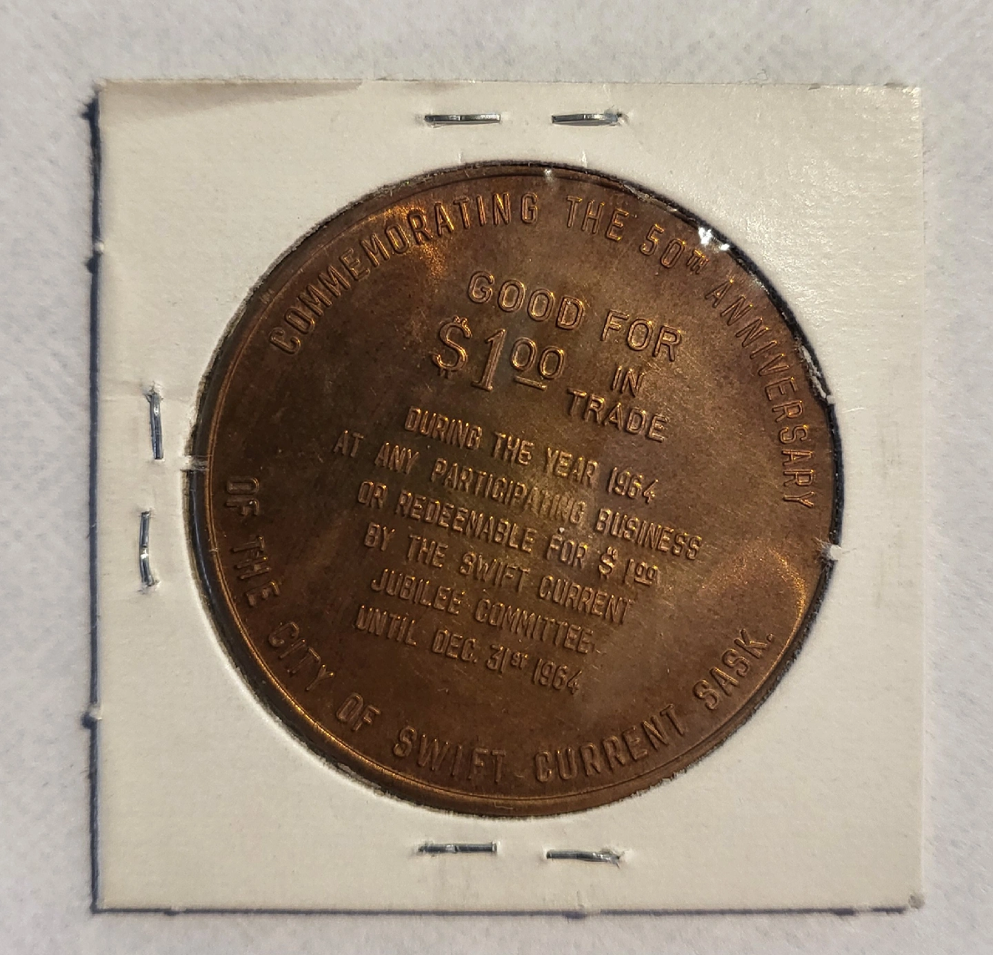 Good for $1.00 in trade during the year 1964 at any participating business or redeemable for $1.00 by the Swift Current Jubilee Committee until Dec 31st 1964. This is a significant part of Saskatchewan history!