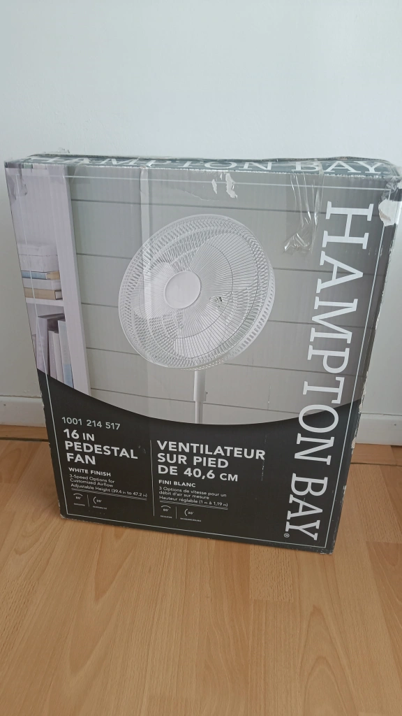 Selling a Hampton Bay 16-inch pedestal fan, still in its original packaging! It features a white finish and adjustable height for customized airflow. Easy to assemble and ready to keep you cool