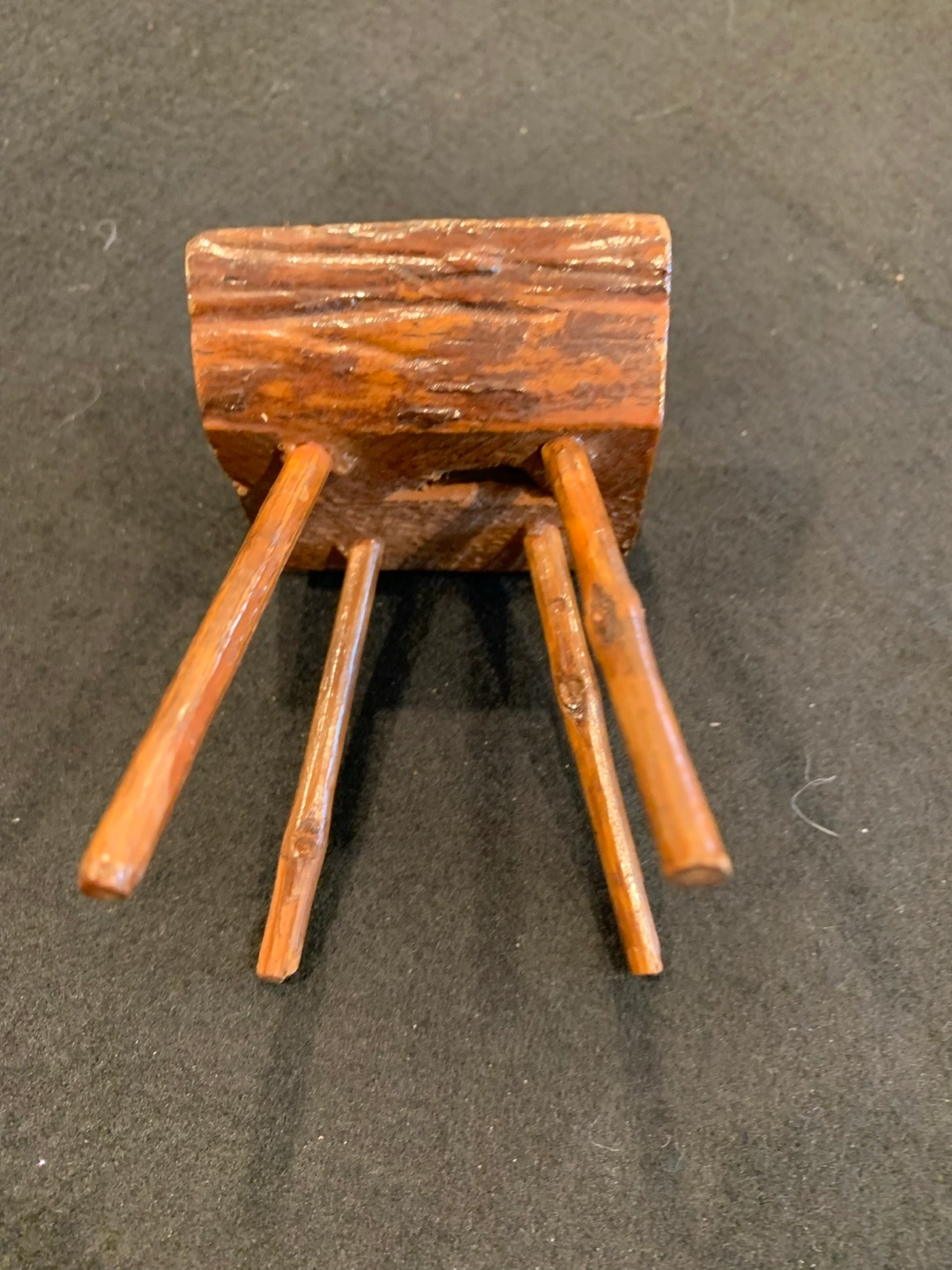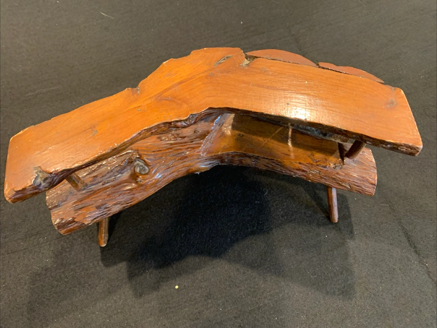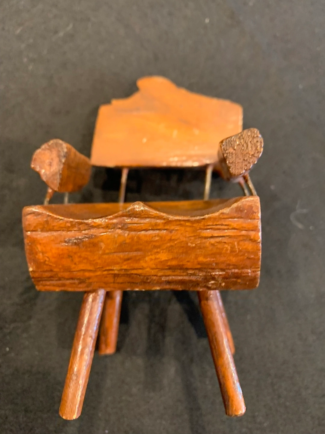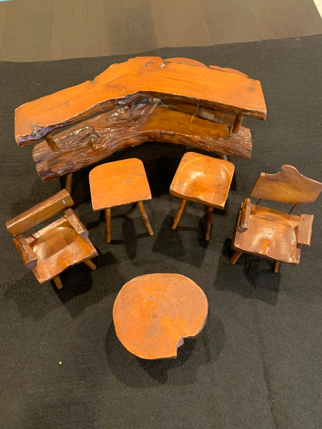 This is a cute set of miniature wooden furniture in a style of George Nakashima, includes chairs, a table, and a bench. The set is in good condition and would be a great addition to any dollhouse or miniature collection