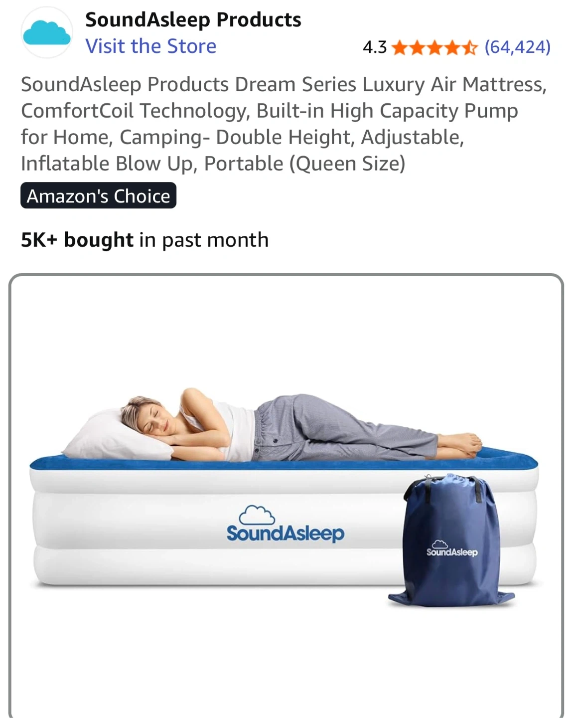 Selling a SoundAsleep Dream Series Luxury Air Mattress. It features ComfortCoil Technology and a built-in high-capacity pump. It's perfect for home, camping, and is double height, adjustable, inflatable, and portable. Queen size. Excellent condition.