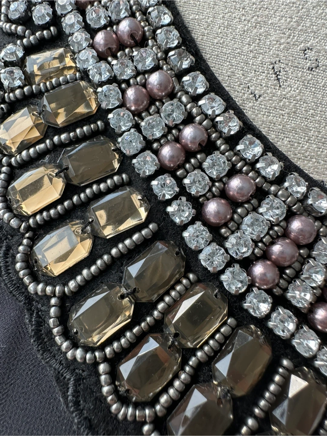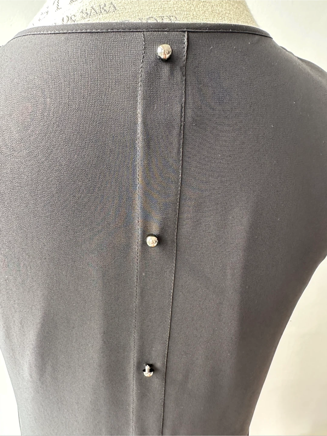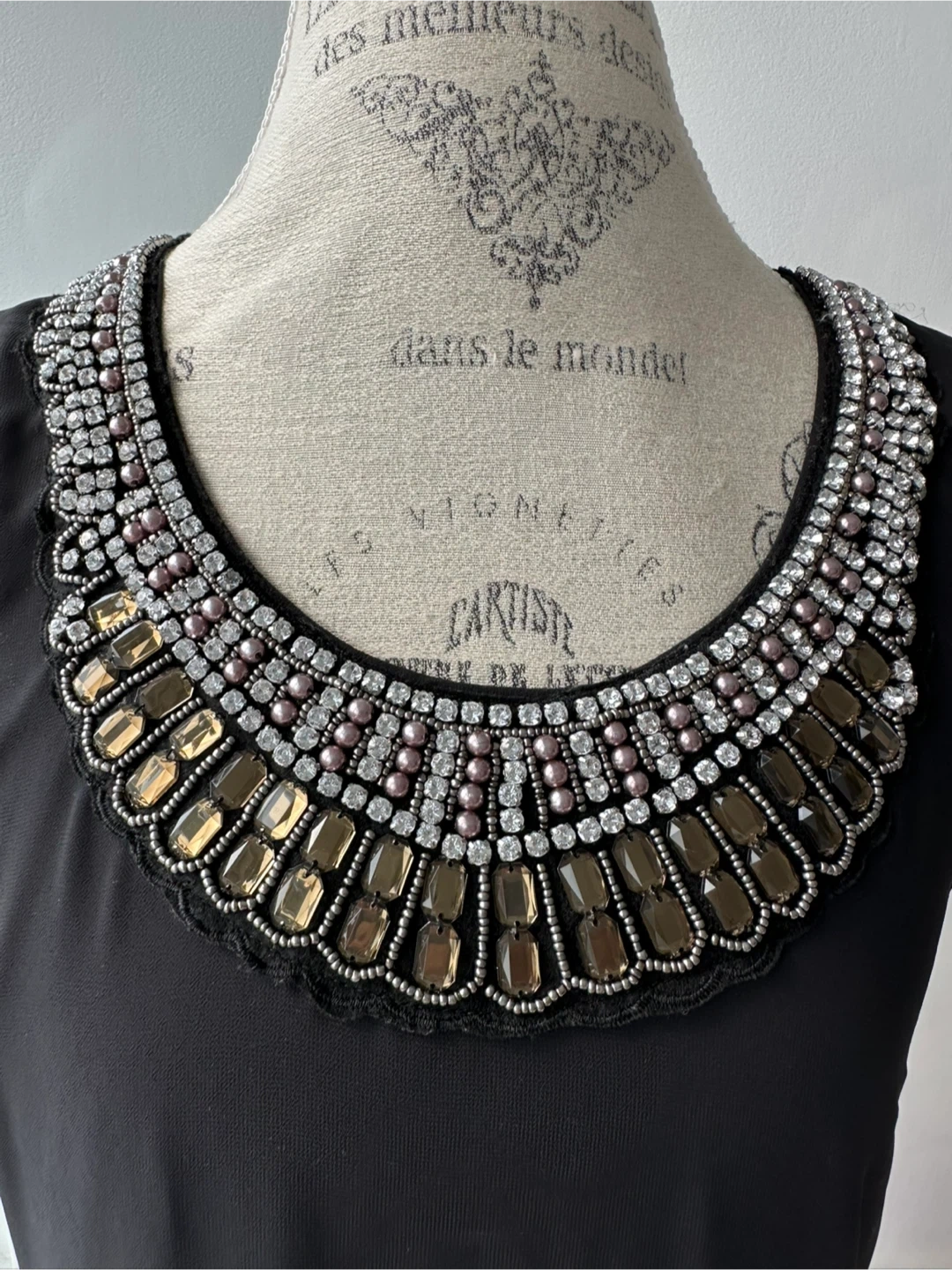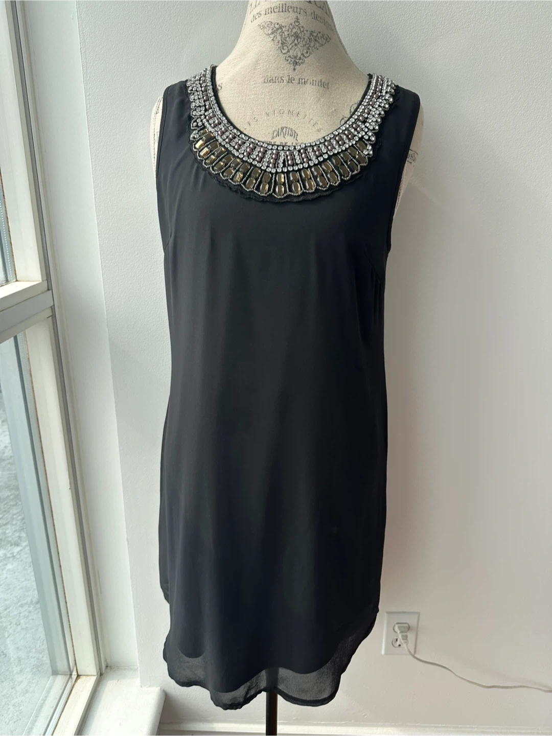 Selling a stylish black sleeveless dress with a beautiful jewelled neckline. It features feminine details like a row of buttons down the back and sheer top layer with lining. Perfect for a night out or a special occasion!