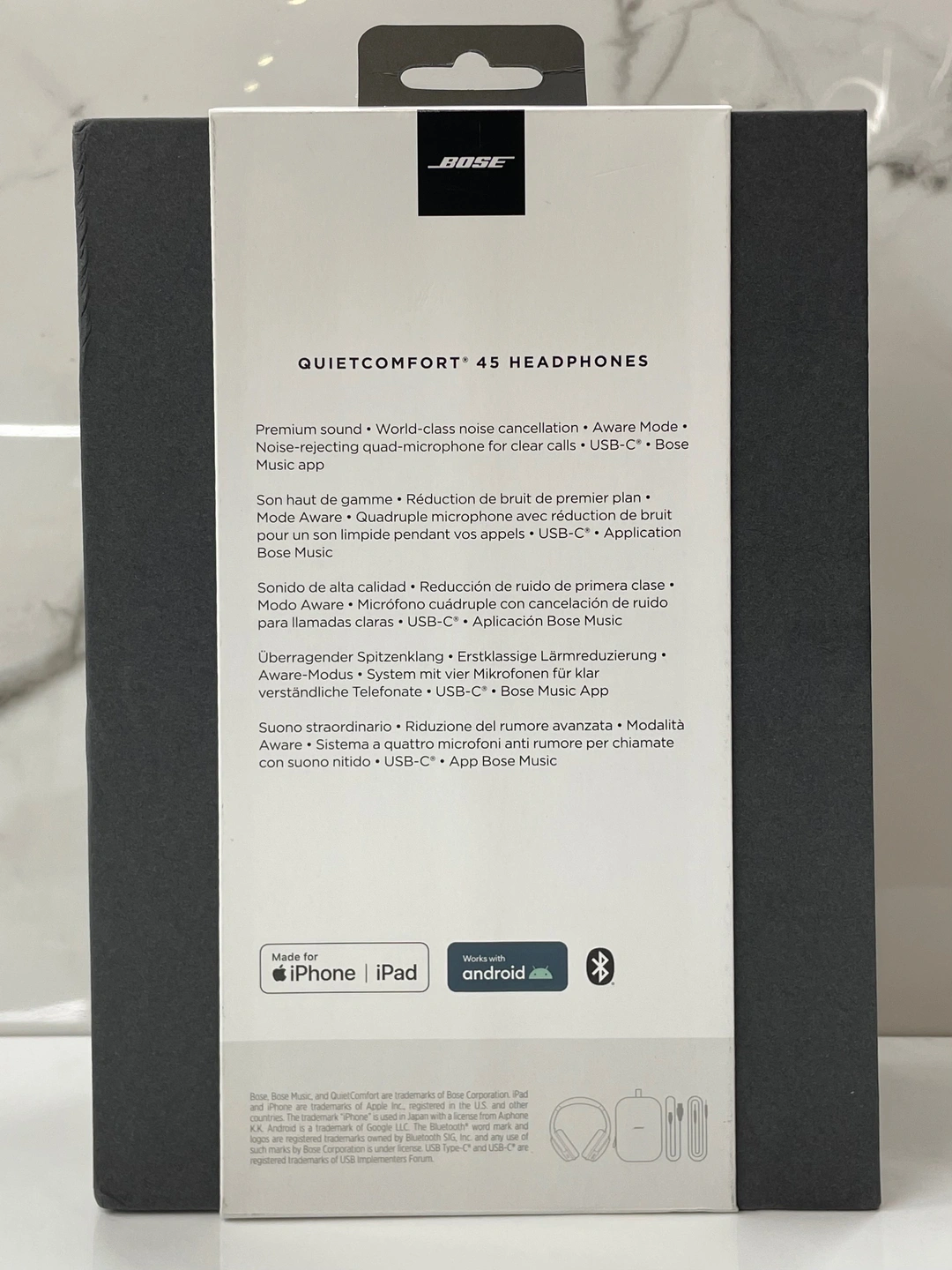 Brand New Bose Quiet Comfort 45 Bluetooth Noise Cancelling Headphones $350 (before taxes) Available at 4 Seasons Pawn Shop & Gold Buyer (Newton Location) 7155 King George Blvd Surrey, BC Canada We are open 9:30 am - 6:00 pm Monday - Saturday and 11:00 am - 6:00 pm on Sundays. For more information visit our shop or give us a call at 6045920223 We accept multiple forms of payment including cash, e transfer, debit, visa, Mastercard, American Express, certified bank. We also have an interest free layaway plan available, ask us for more information. Thank you for your interest in our products. #101923266