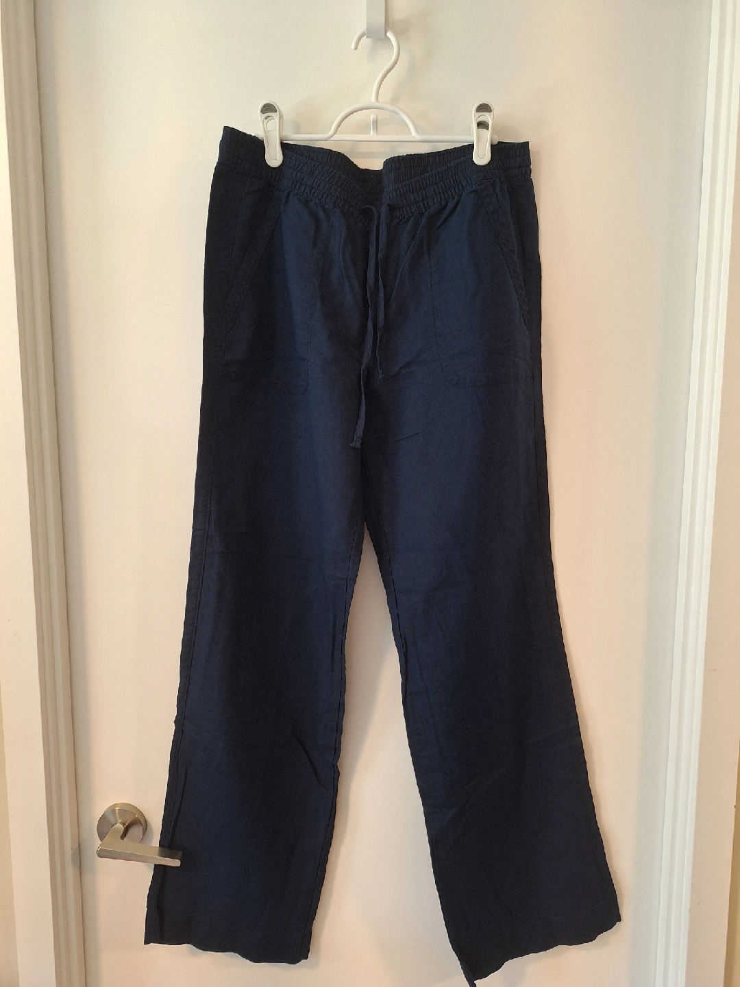 Selling a pair of Joe Fresh linen pants in size medium. They're a nice dark blue colour and would be great for any season! They have a comfortable elastic waistband with a drawstring.