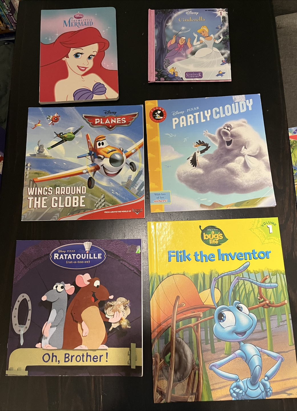 Selling a collection of Disney Pixar children's books! Includes titles like The Little Mermaid, Cinderella, Planes: Wings Around the Globe, Partly Cloudy, Ratatouille: Oh, Brother!, and A Bug's Life: Flik the Inventor