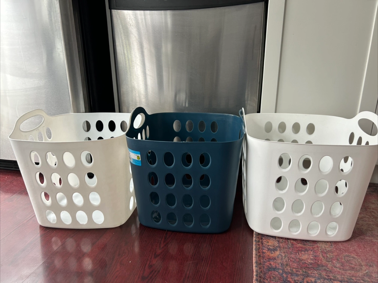 Selling two white and one blue Plastic laundry baskets. They are in great shape and ready for a new home. Originally bought for $4.75/each at Dollarama.